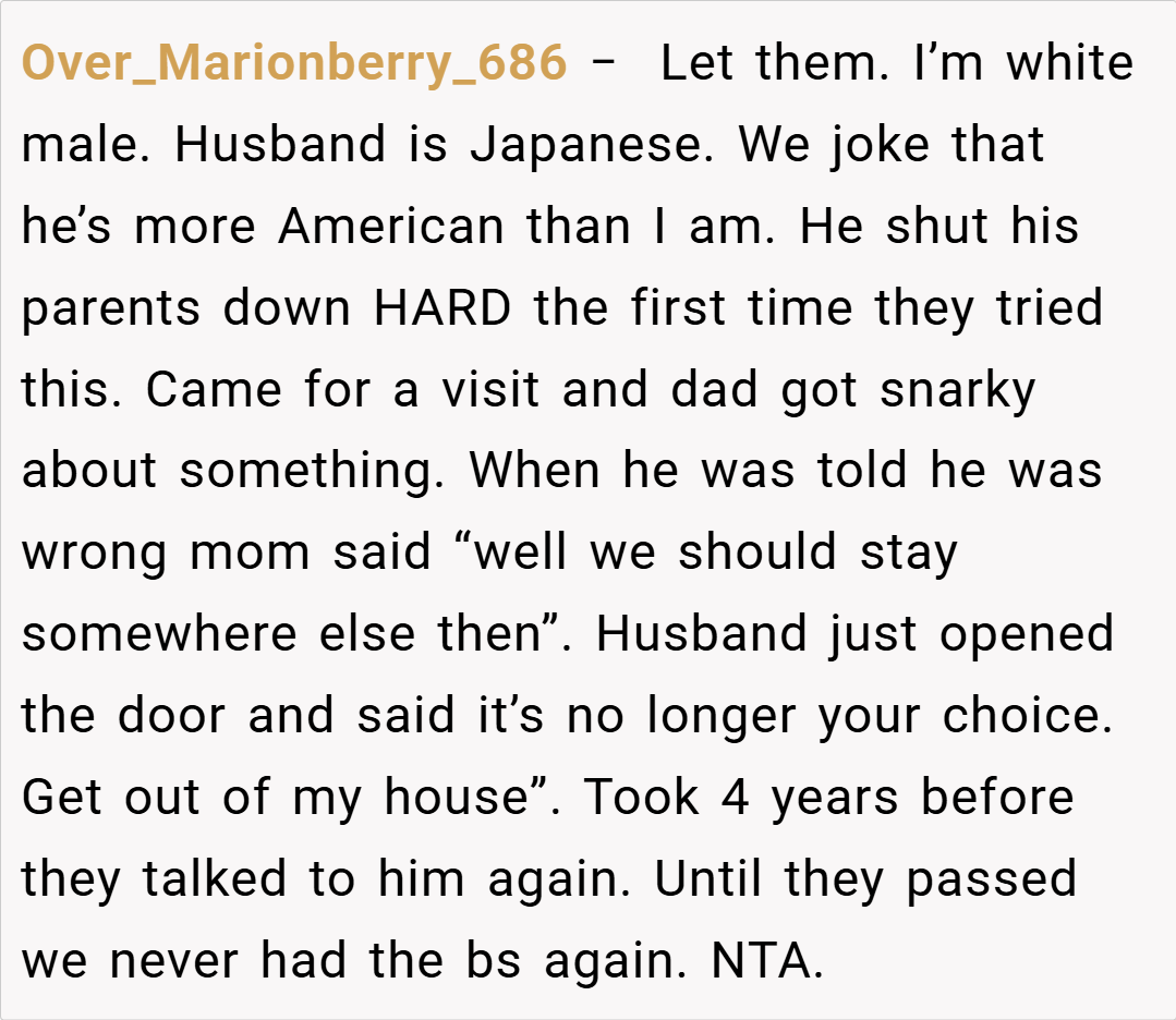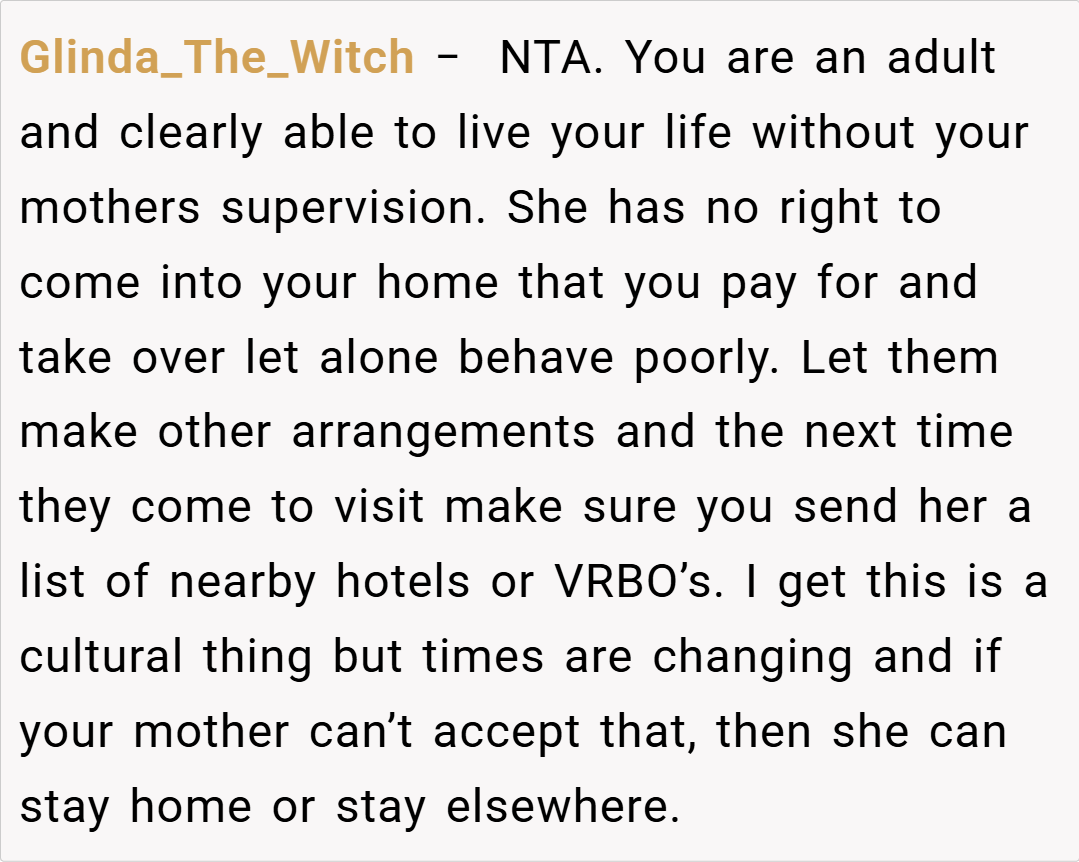 Several users advised that arranging alternative accommodations for her parents might actually lead to a healthier relationship in the long run. Others emphasized that the silent treatment and manipulation tactics are toxic and should not be tolerated. Overall, the consensus is that the OP’s stance is entirely justified—her insistence on being treated with respect and given her personal freedom is something every adult deserves, regardless of cultural expectations.