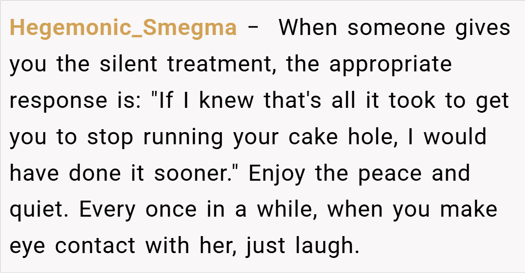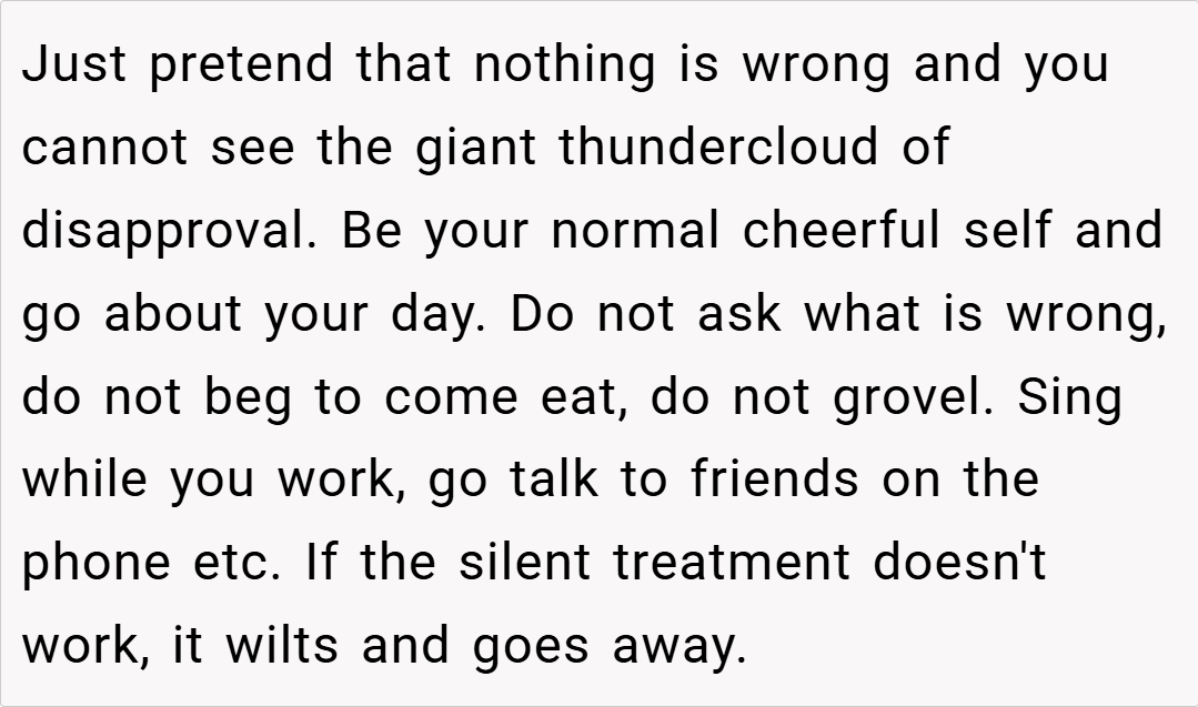 This dynamic is exacerbated when one parent, like OP’s father, plays the role of the enabler—minimizing conflict by pushing responsibility onto the child instead of addressing the problematic behavior. But let’s talk about the real villain here: the silent treatment. Experts widely agree that using silence as a punishment is a form of emotional manipulation.