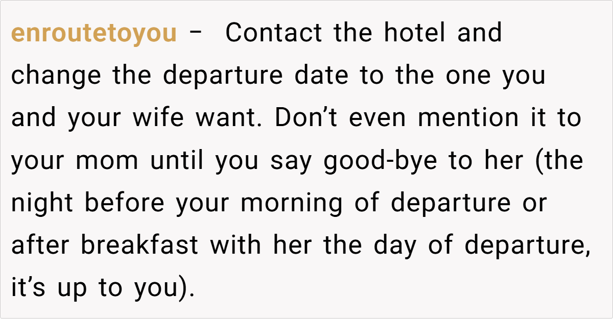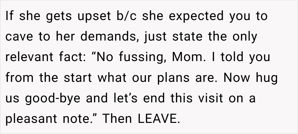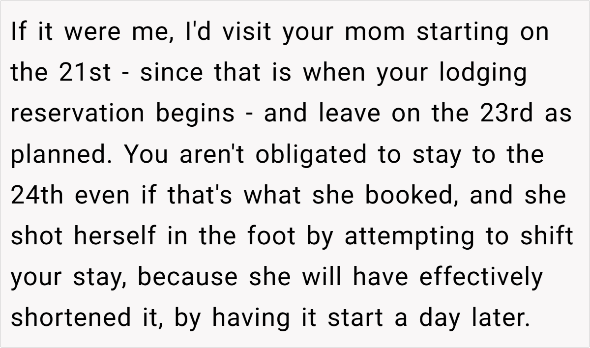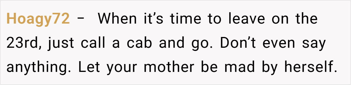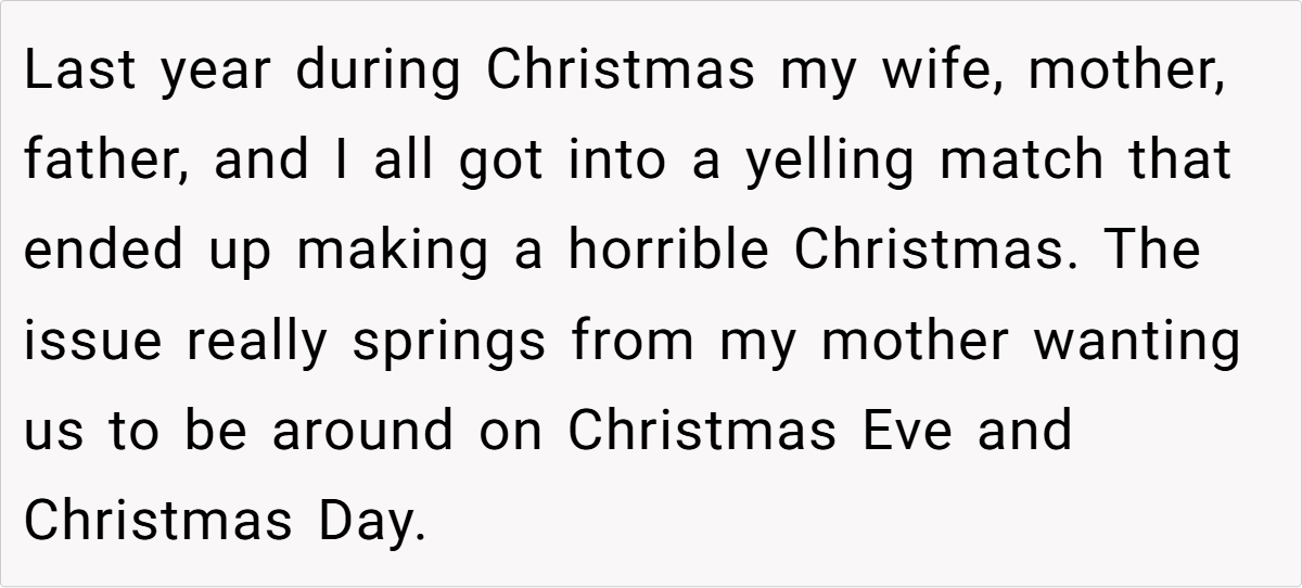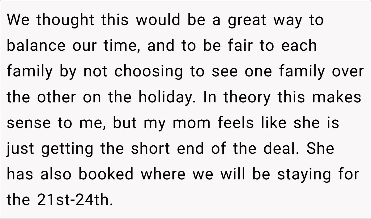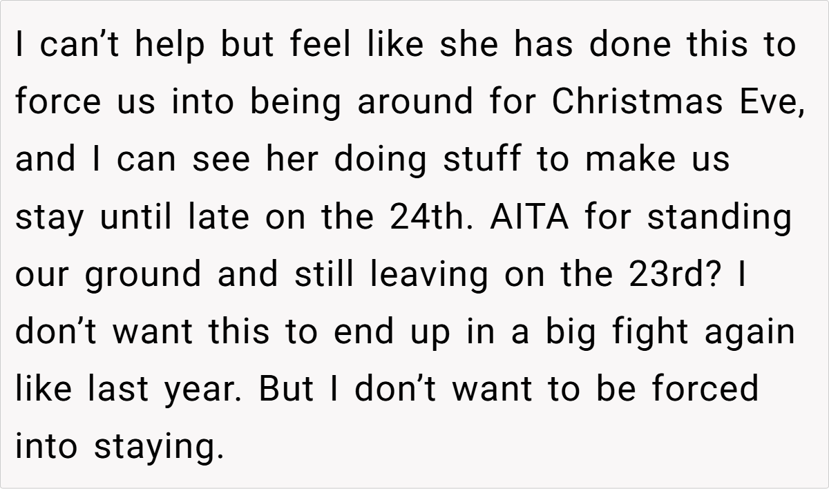 However, his mother feels slighted, particularly after booking accommodations that imply they should stay through Christmas Eve. Now, he’s standing firm on their plans but wonders if he’s in the wrong. Read the full story below to weigh in.