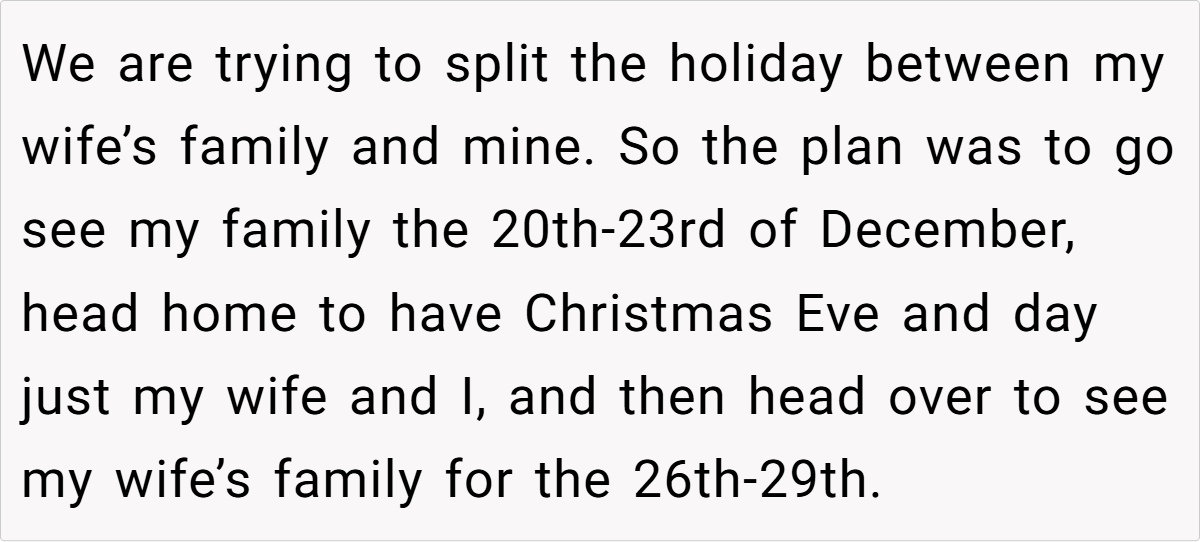 A Redditor (28M) and his wife (26F) are navigating holiday tensions with his family after past conflicts, including a yelling match that ruined Christmas the previous year. To balance time between families, they planned to visit his family from December 20-23, spend Christmas Eve and Christmas Day as a couple, and visit her family afterward.