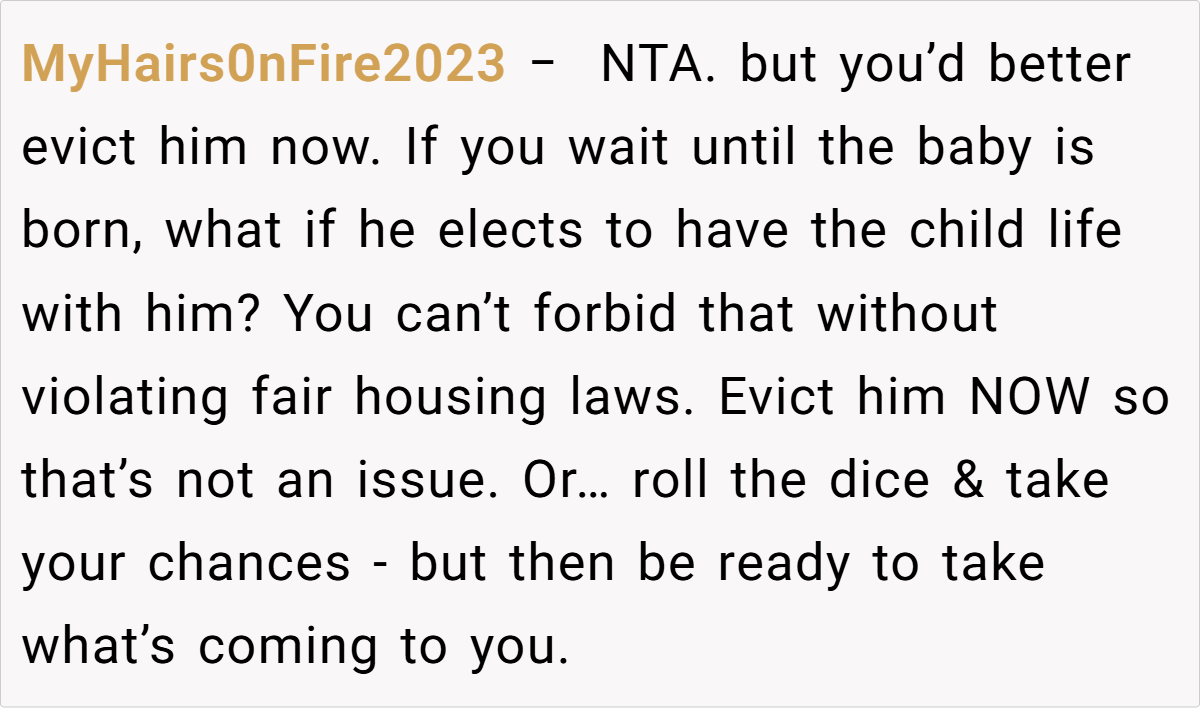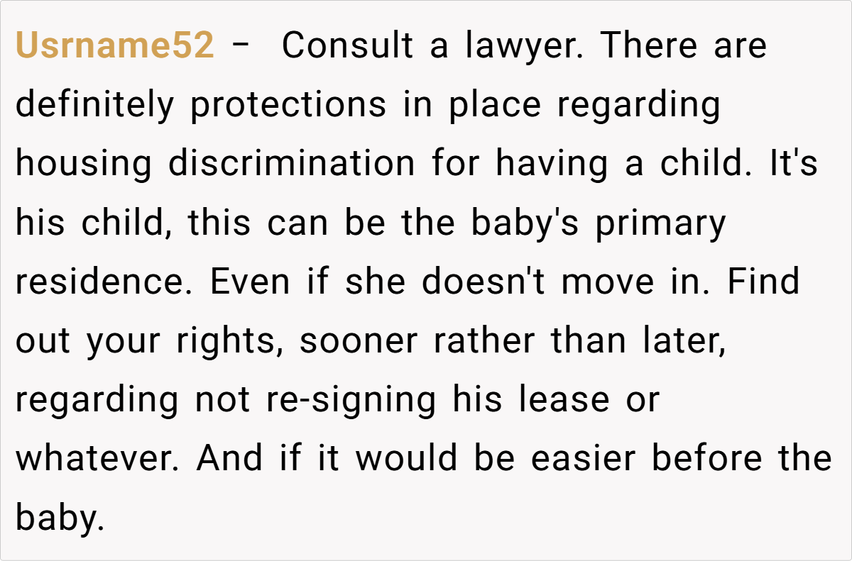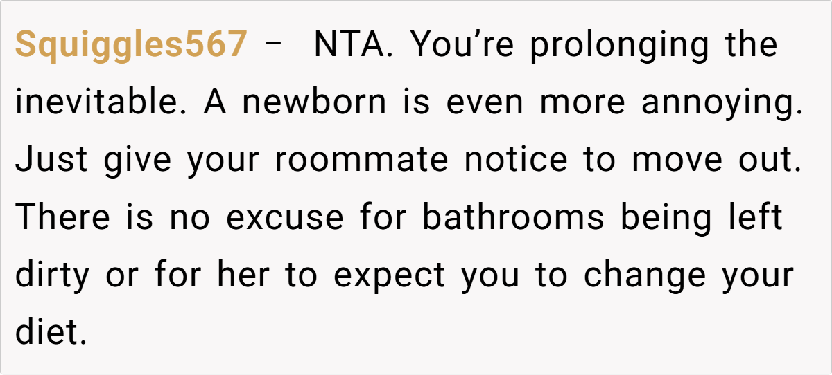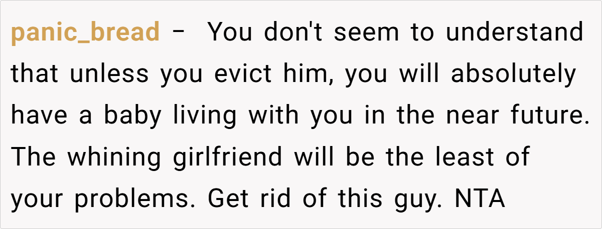 Many comments suggest that the roommate needs to make alternative living arrangements before the situation escalates further, especially with the impending arrival of the baby. Some commenters express concern about the potential future situation, where the roommate may try to have his girlfriend and child live in the apartment. The consensus is that if the situation is not addressed now, it will only get more complicated in the future.