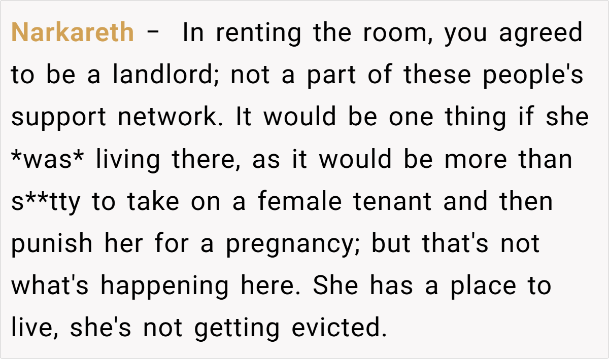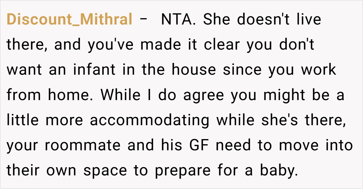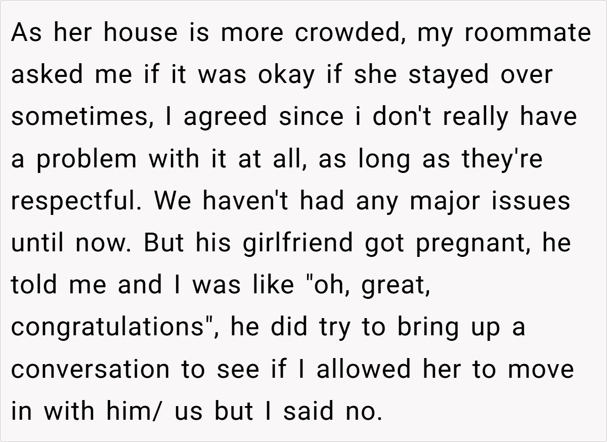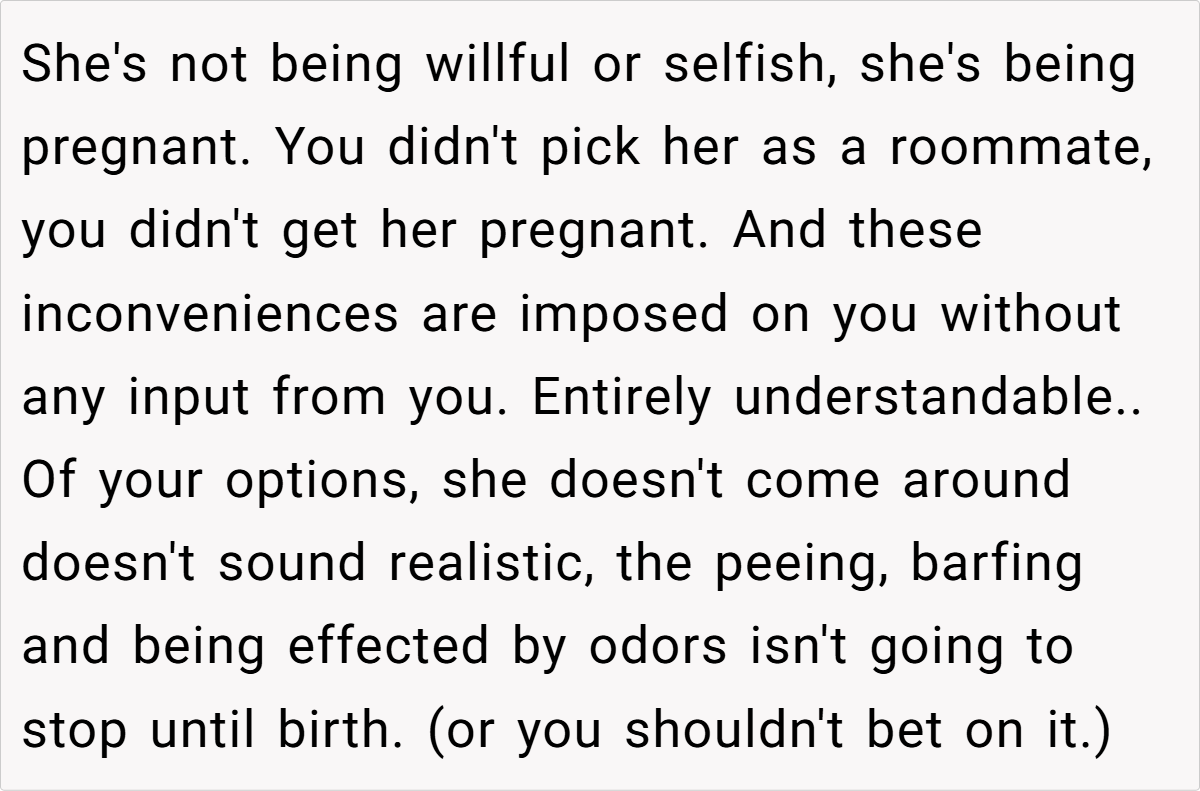 The majority of Reddit commenters are on the side of the original poster, agreeing that the roommate’s actions—asking for his pregnant girlfriend to stop staying over or that he move out—were justified. They note that while pregnancy comes with its challenges, it does not give the girlfriend the right to disrupt someone else’s life in such a significant way.