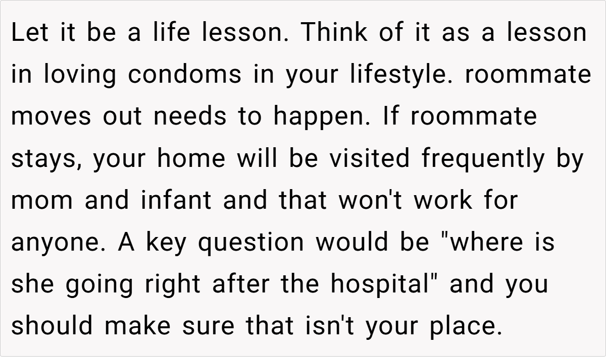 At the same time, while the girlfriend’s pregnancy is a physical challenge, it should not come at the expense of someone else’s comfort and living arrangements. Dr. Berman’s insight emphasizes that the decision to ask his roommate to move out isn’t just about discomfort—it’s about setting boundaries that allow everyone to live respectfully and comfortably within their shared space.