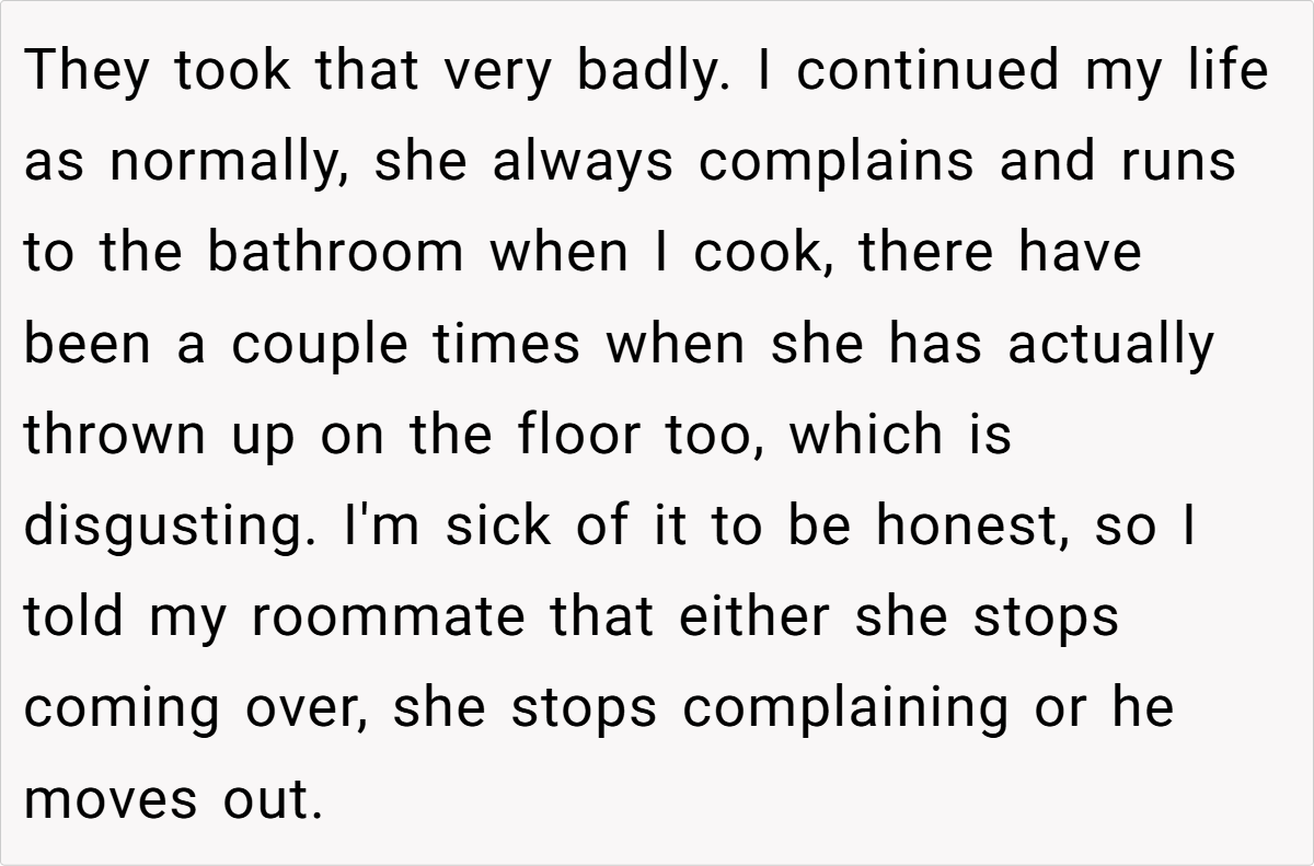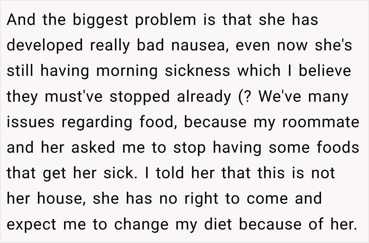 When living with roommates, it’s crucial to establish clear boundaries and respect for personal space—both for your well-being and to ensure a harmonious living situation. In this case, the pregnant girlfriend’s constant presence and the issues caused by her morning sickness, such as vomiting and increased bathroom use, have disrupted the original living agreement.