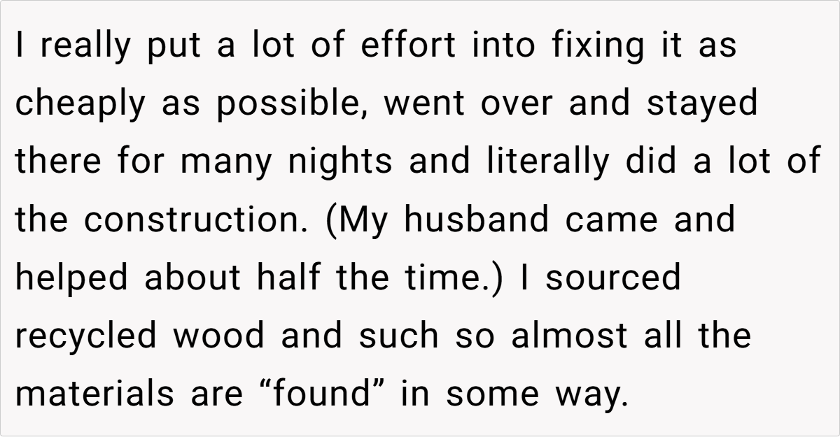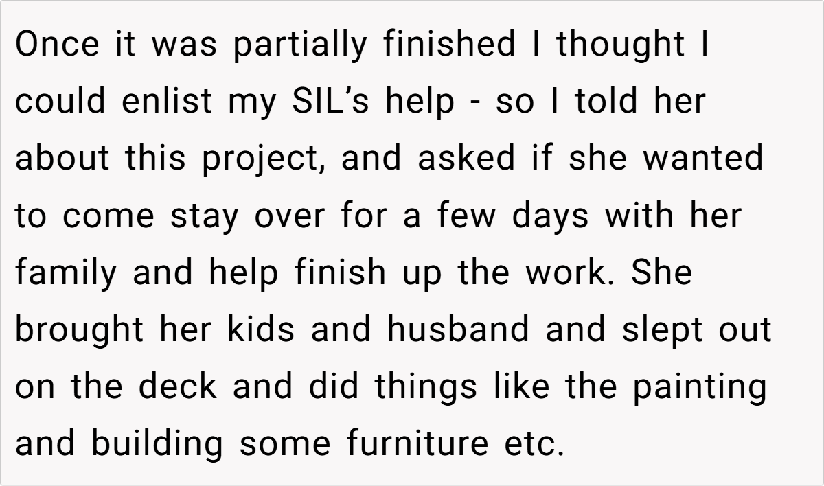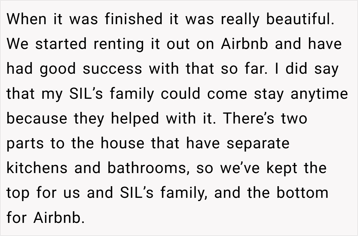 With a nod to family support, she once offered her sister-in-law’s family free use of one section of the house in exchange for their help during construction. However, when her SIL’s family recently stayed there during an Airbnb booking and issues arose between her kids and paying guests, she drew a firm line.
