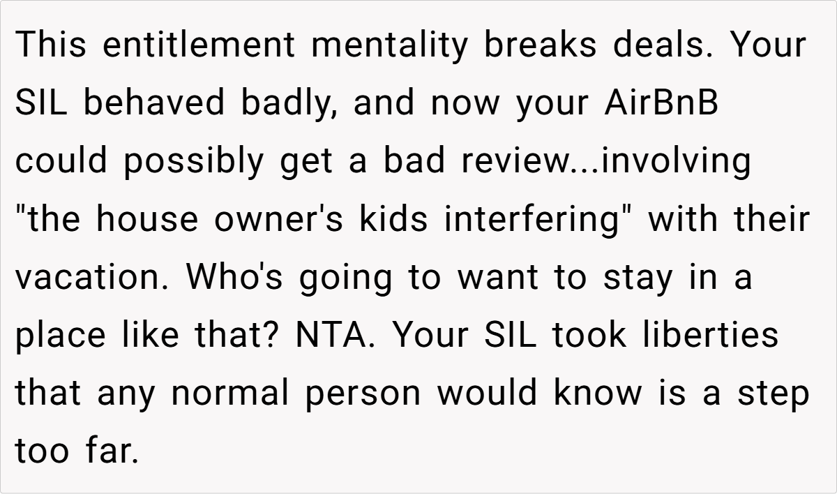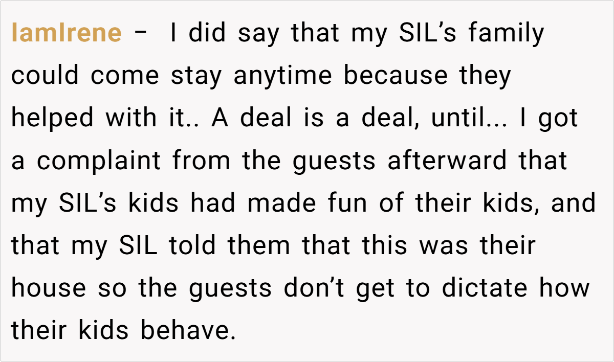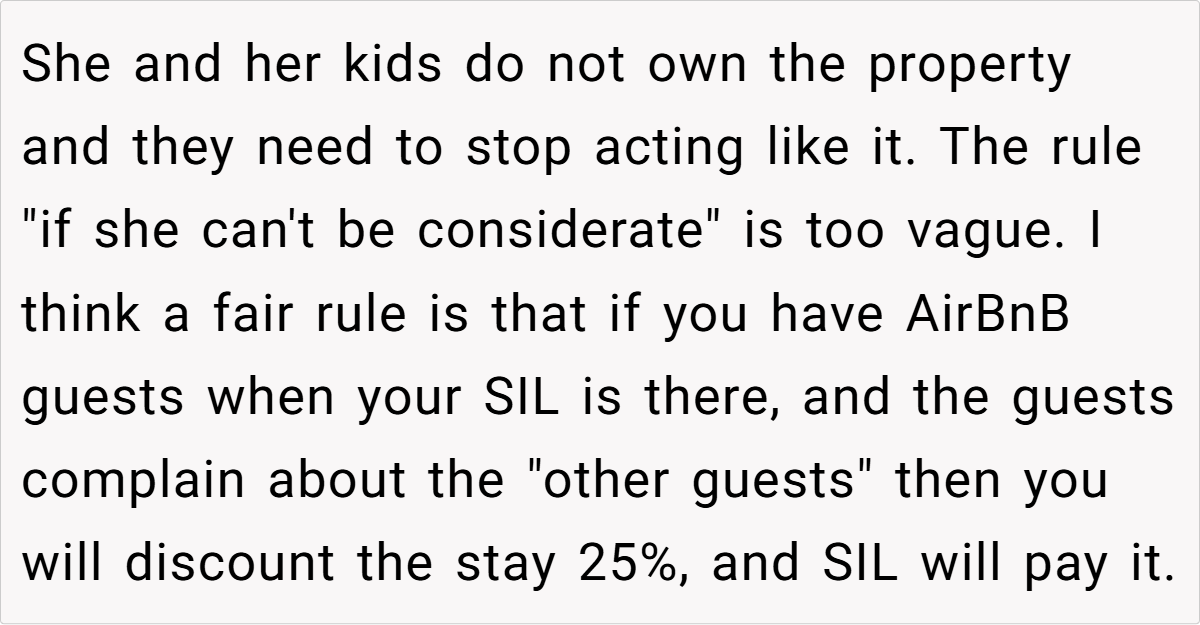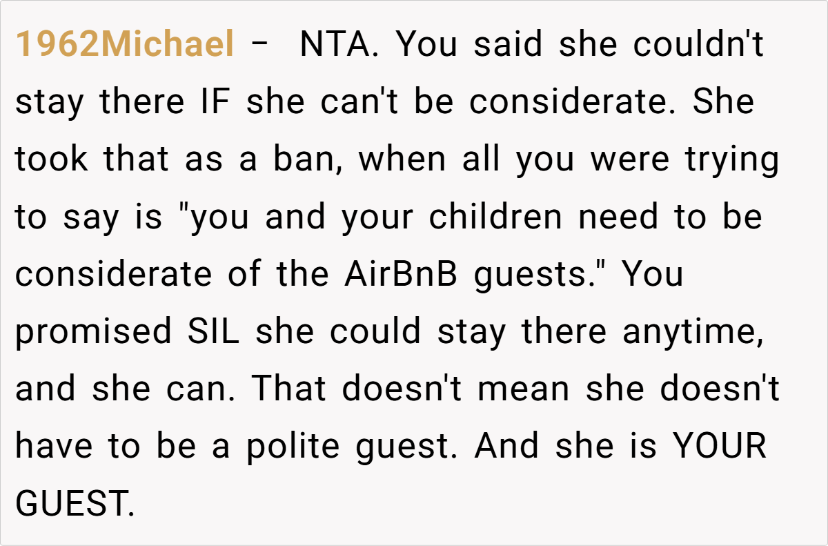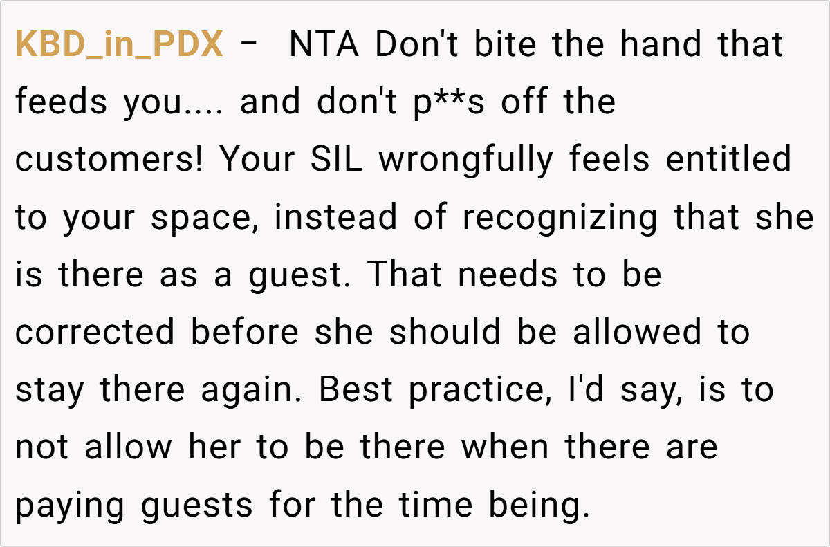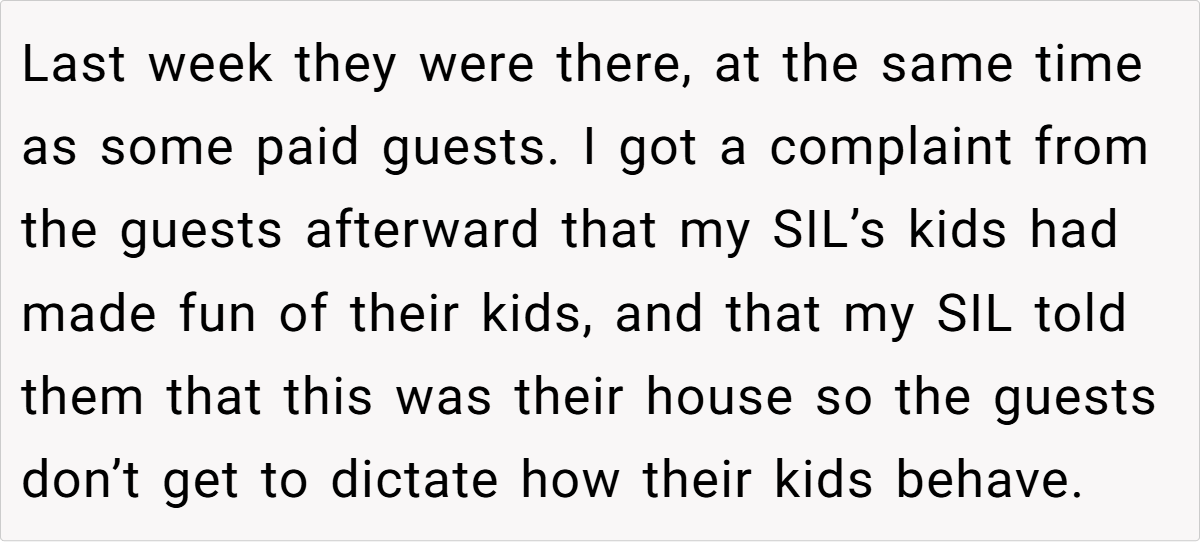 In a heated discussion, she told her SIL that her family could no longer stay at the property if they couldn’t respect the rules of a business environment. Now, with emotions running high, she’s wondering if she was wrong for enforcing that boundary.