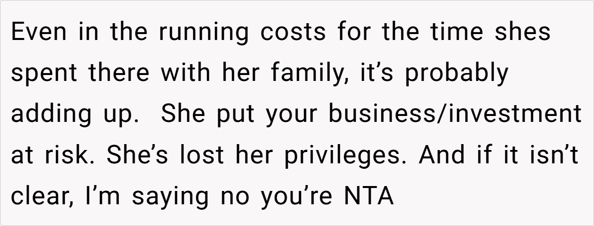 She also adds that this isn’t about cutting ties with family, but about ensuring that everyone understands the dual nature of the property. “An agreement made in the context of a family project isn’t set in stone. When the property becomes a revenue-generating asset, it’s entirely reasonable for the owner to re-evaluate those privileges.” This approach helps maintain a respectful balance between familial generosity and business accountability.
