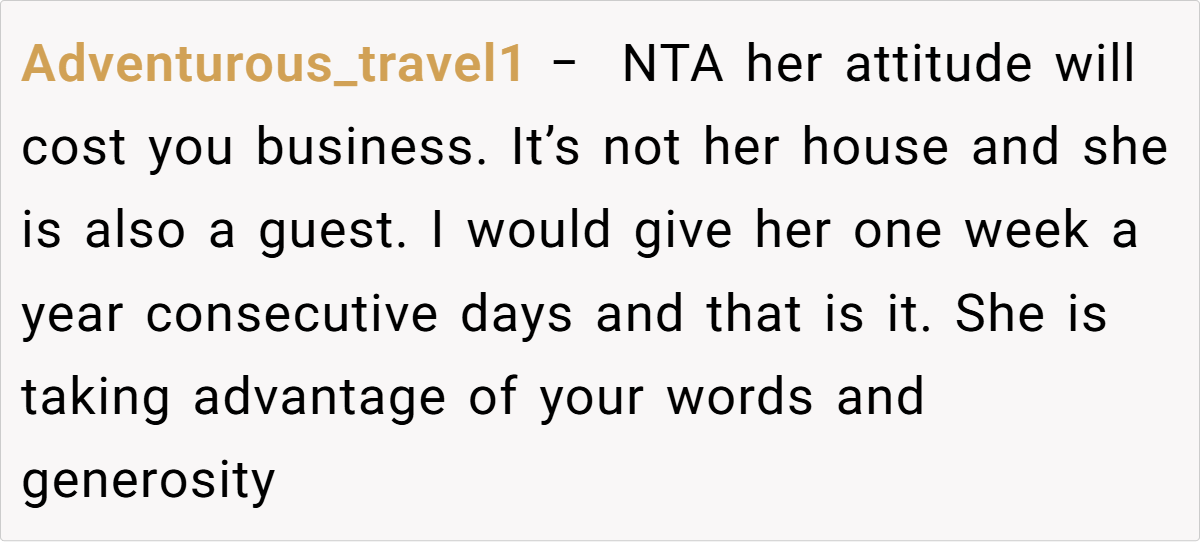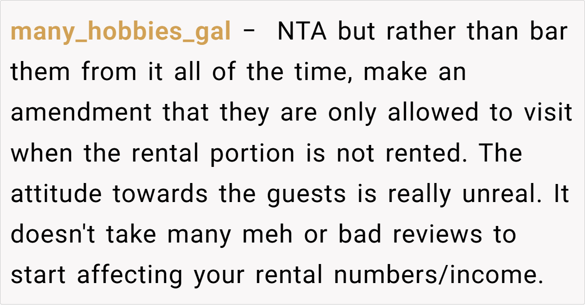 The Reddit community has expressed mixed reactions to this scenario. Many users sympathize with the host’s position, arguing that when a property doubles as a business, the rules need to change to accommodate customer expectations. They point out that while family support is invaluable, it shouldn’t come at the cost of tarnishing a business’s reputation.