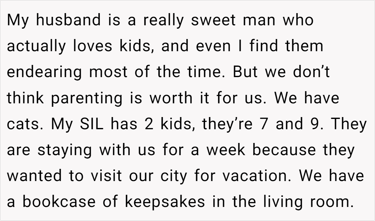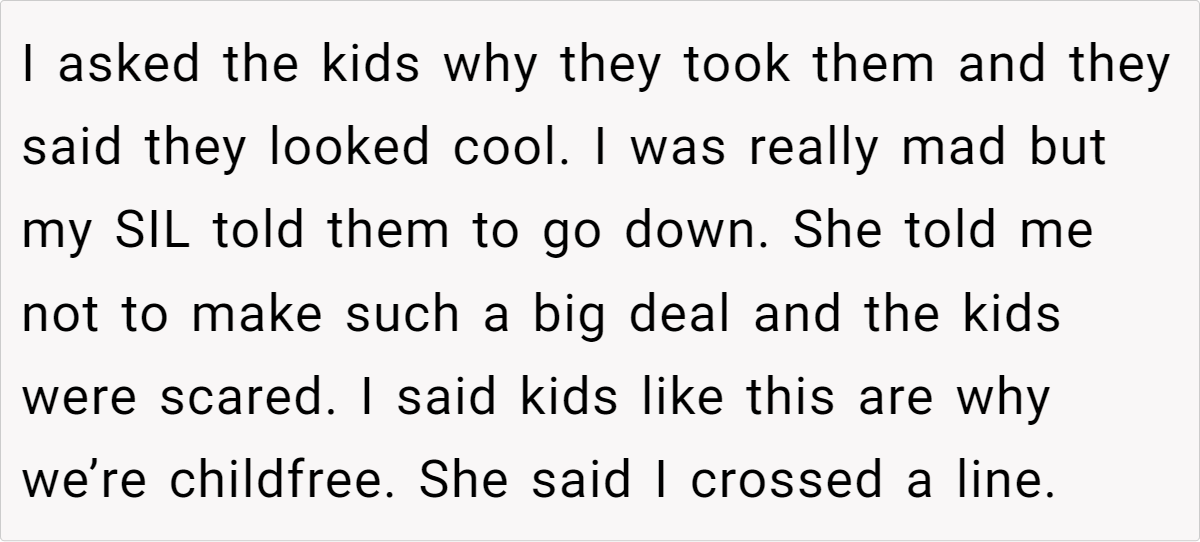 At the end of the day, this story isn’t just about a few missing keepsakes—it’s about the broader issues of respect, accountability, and the clash between different lifestyles and parenting philosophies. The OP’s blunt statement about choosing to be childfree because of the misbehavior of her sister-in-law’s children was her way of setting a boundary in a situation that had already crossed the line of acceptable behavior.