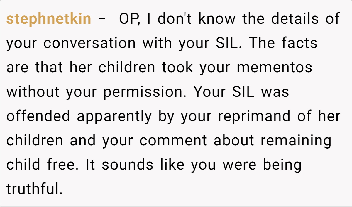 The prevailing sentiment among commenters is that the OP is not the asshole. Many feel that, as a host in her own home, she had every right to be upset when her treasured keepsakes were taken without permission. The community largely agrees that the sister-in-law’s response was dismissive and that her children should be held accountable for their actions. The consensus is clear: while the comment about being childfree might have been blunt, it was a reflection of genuine frustration with behavior that, in the eyes of many, simply shouldn’t be tolerated.