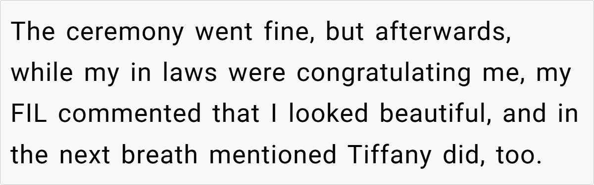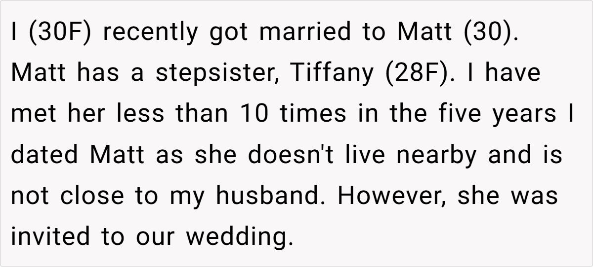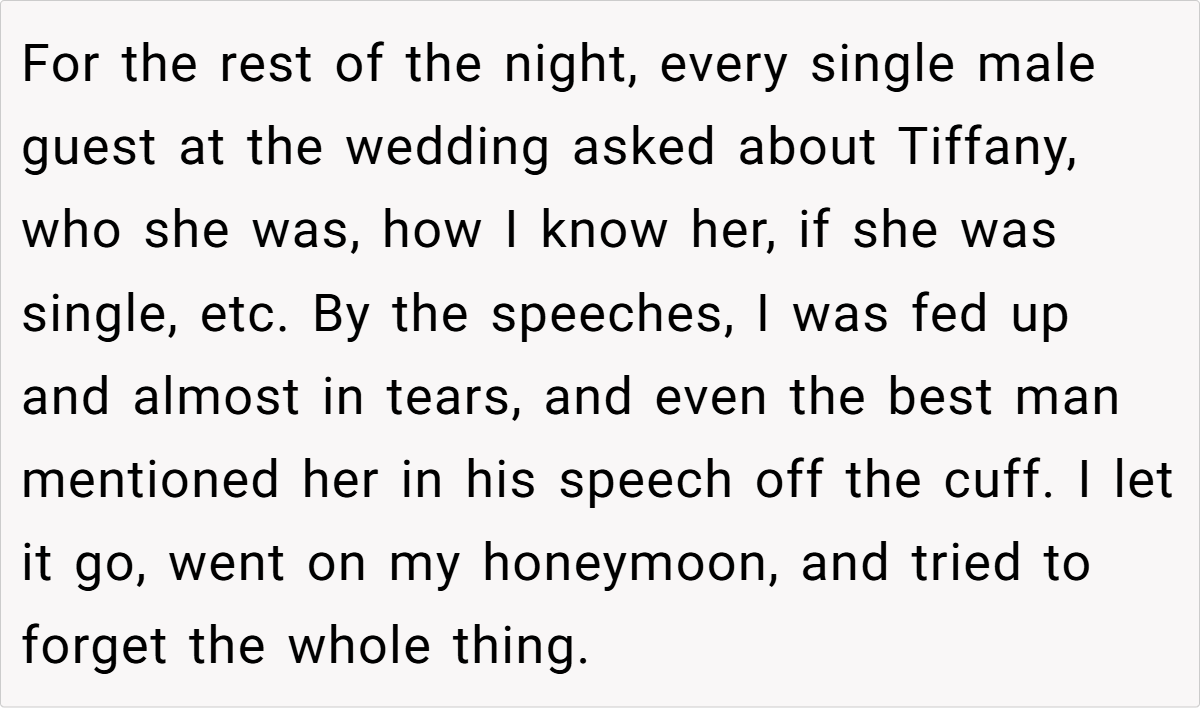 Weddings are supposed to be about love, celebration, and the couple at the center of it all. But for OP, her wedding night was overshadowed by insecurity and comparison—not because anyone intentionally stole the spotlight, but because her husband’s stepsister, Tiffany, simply existed.