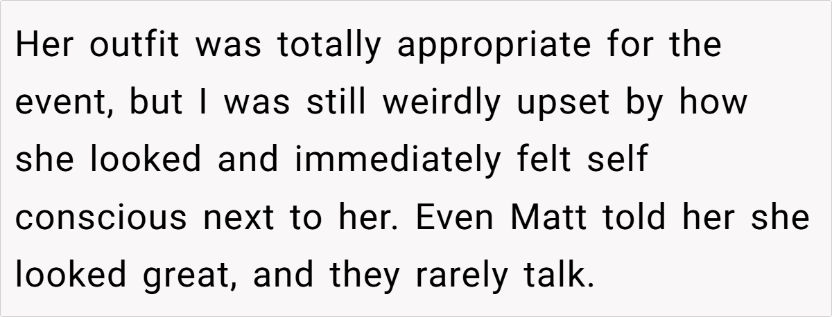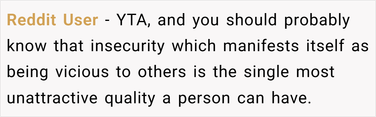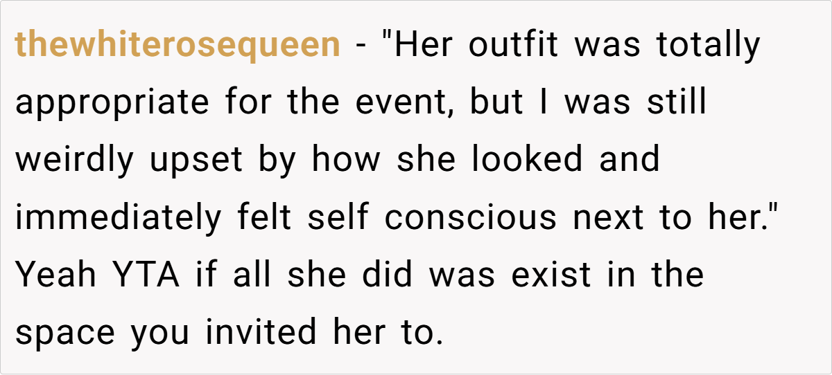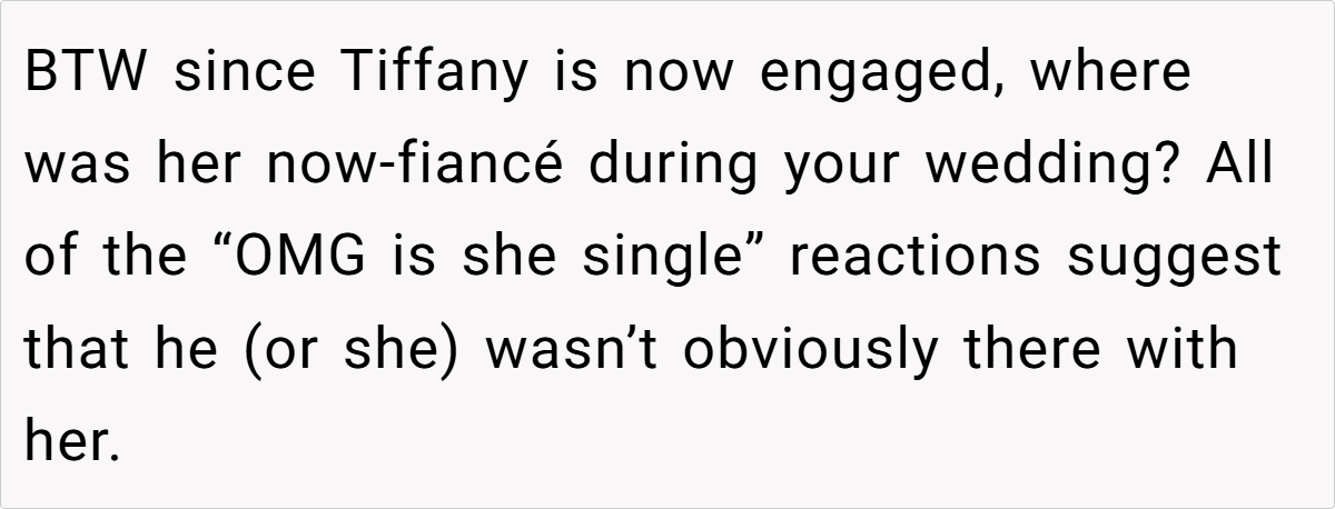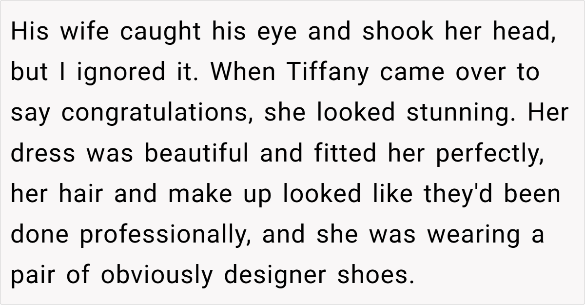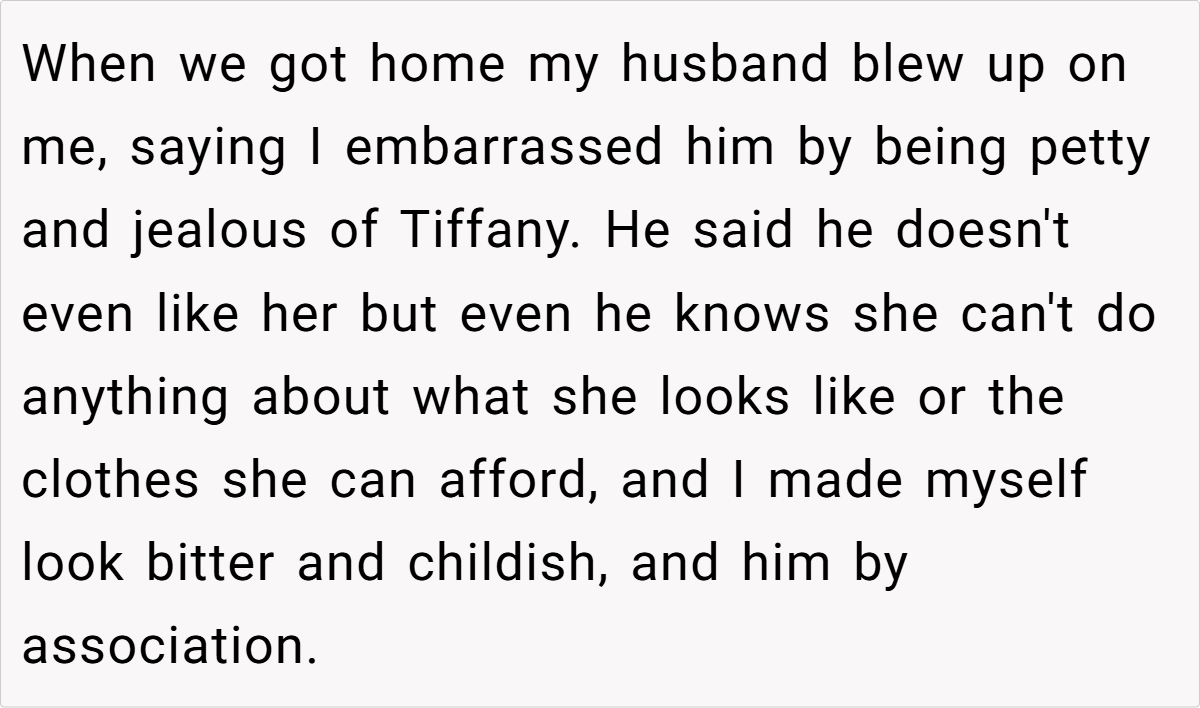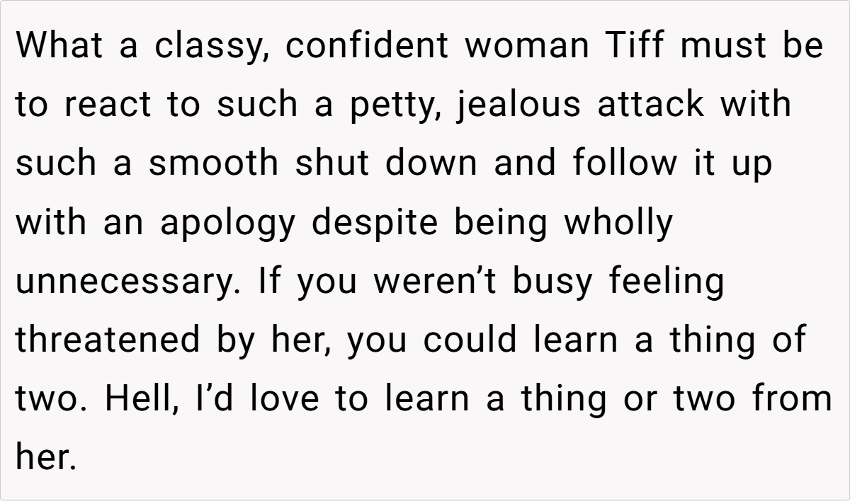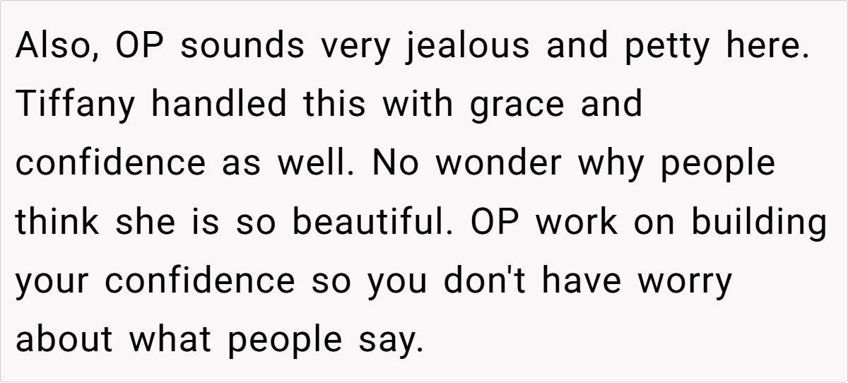 In contrast, OP came across as bitter, insecure, and petty, reinforcing the very thing she feared—that Tiffany was the more confident and self-assured woman in the room.