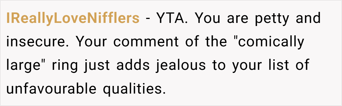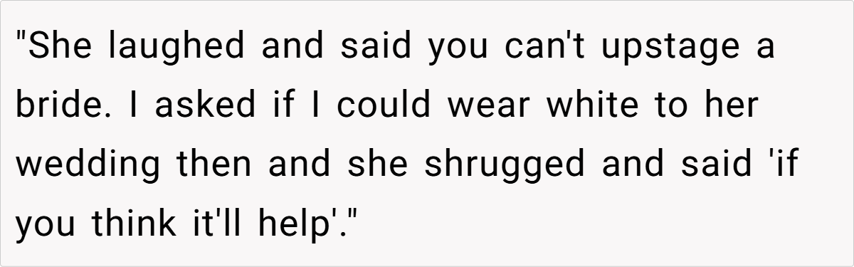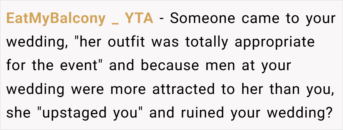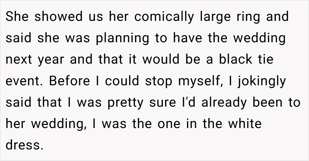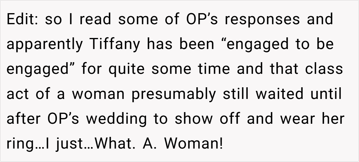 Tiffany is beautiful, stylish, and effortlessly confident, and OP felt overshadowed by her presence at the wedding, especially after hearing multiple male guests comment on Tiffany’s looks. Later, when Tiffany announced her own engagement, OP snapped and made a passive-aggressive remark, claiming she had already been to Tiffany’s wedding—because Tiffany had “upstaged” her own.
