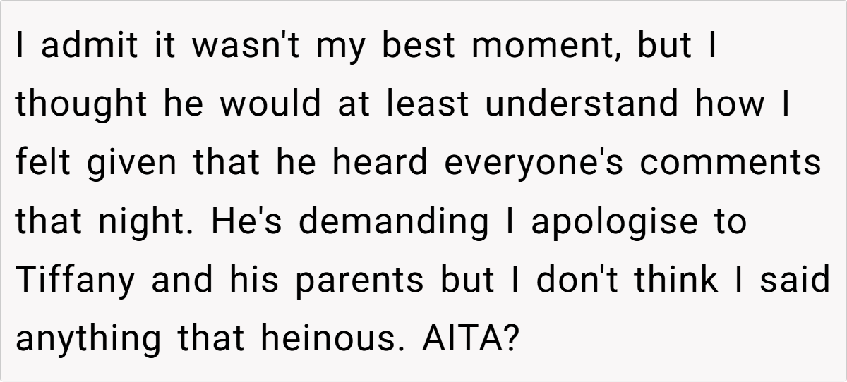 Now, OP’s husband is furious and embarrassed by her outburst, saying she came across as jealous and petty. He wants her to apologize, but OP thinks she was just being honest. So, did she have a point, or was this a case of personal insecurities ruining a relationship?