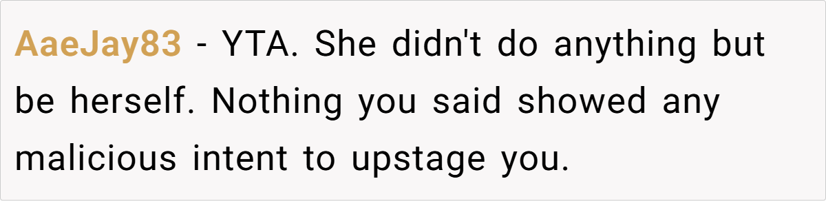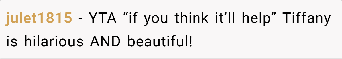 What makes Tiffany truly “upstage” OP is her confidence and grace under fire. When OP made a sarcastic dig, Tiffany responded coolly with, “If you think it’ll help.”