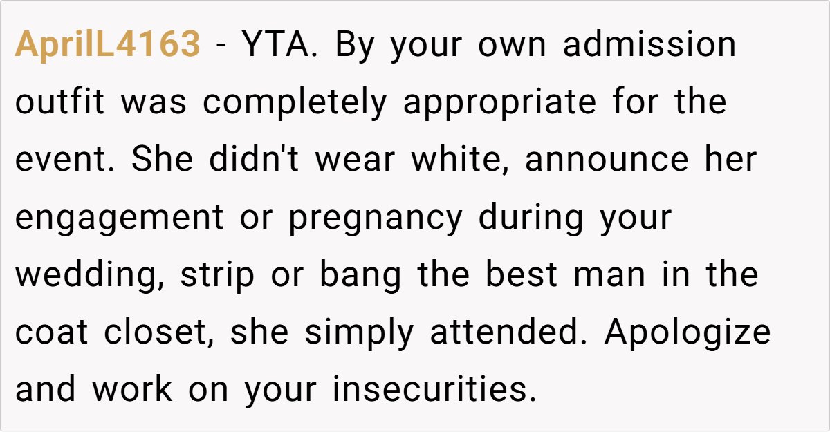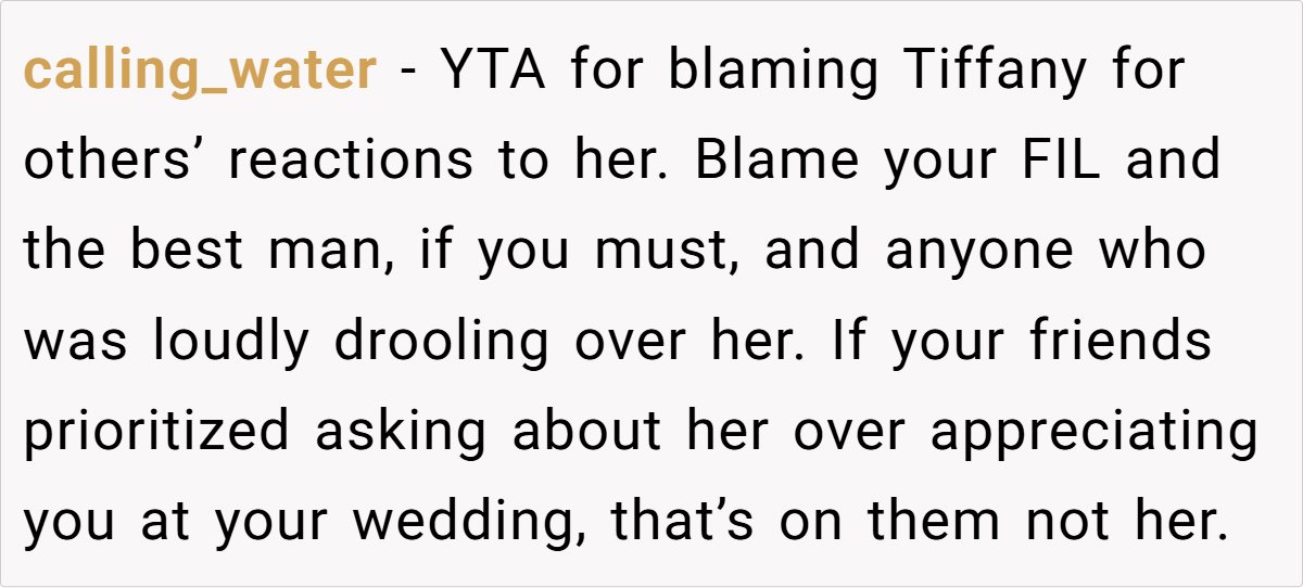 OP’s real issue wasn’t Tiffany—it was her own self-doubt. No one can “steal the spotlight” at your wedding unless you let them. Instead of blaming Tiffany for simply existing, OP needs to focus on her own confidence and self-worth.