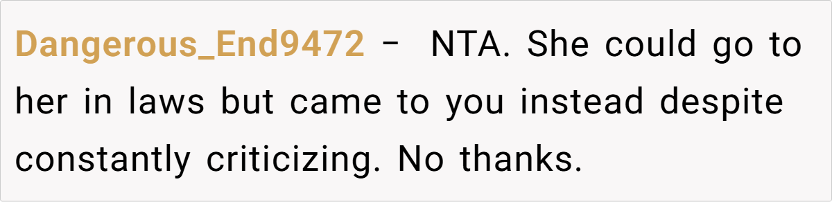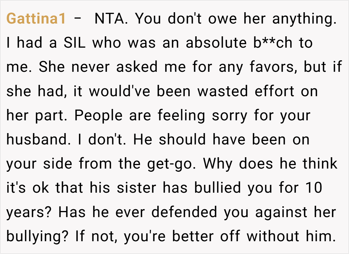 The Reddit community is largely in support of OP’s decision. Commenters argue that SIL’s behavior—marked by years of bullying and an entitlement mentality—is unacceptable. Many users express that OP’s stance of refusing to act as a provider is justified and a necessary assertion of self-respect.
