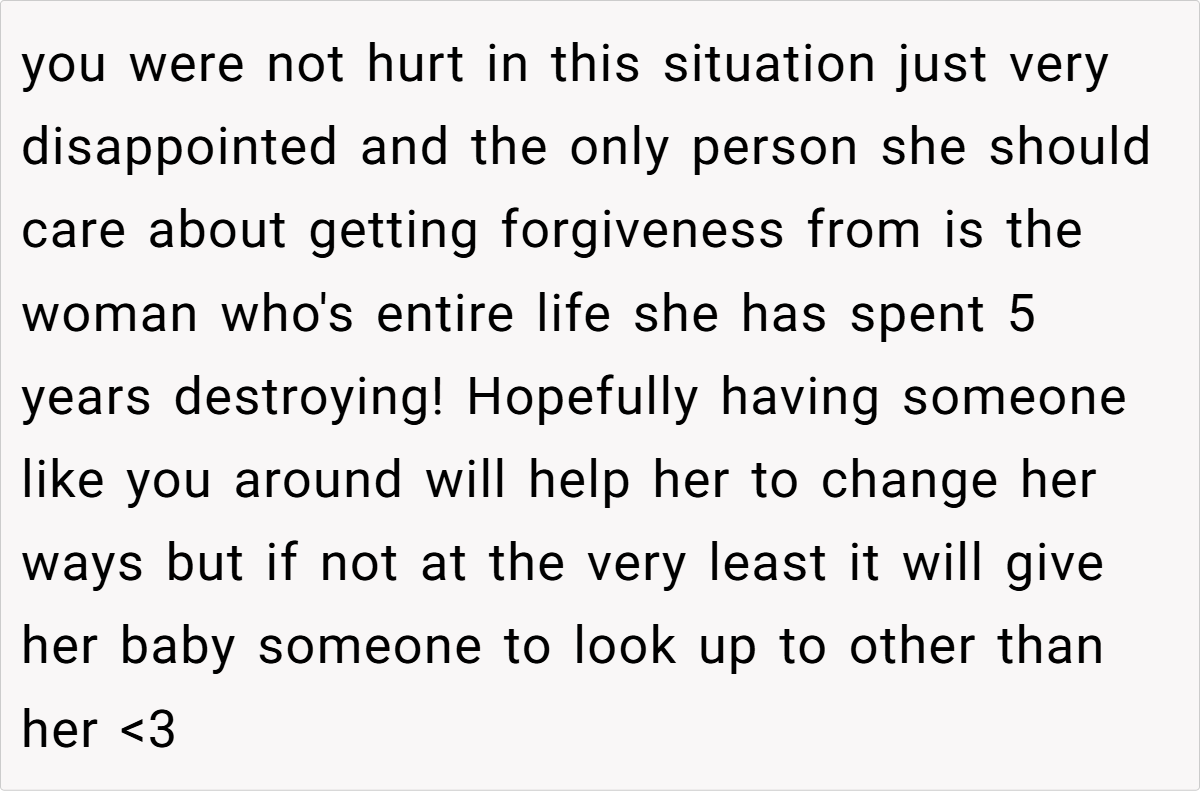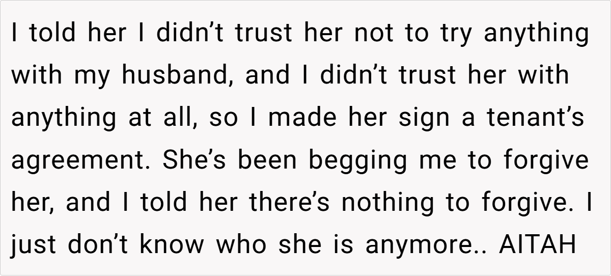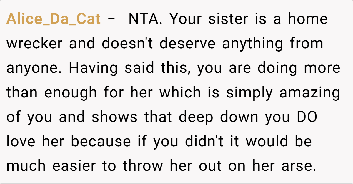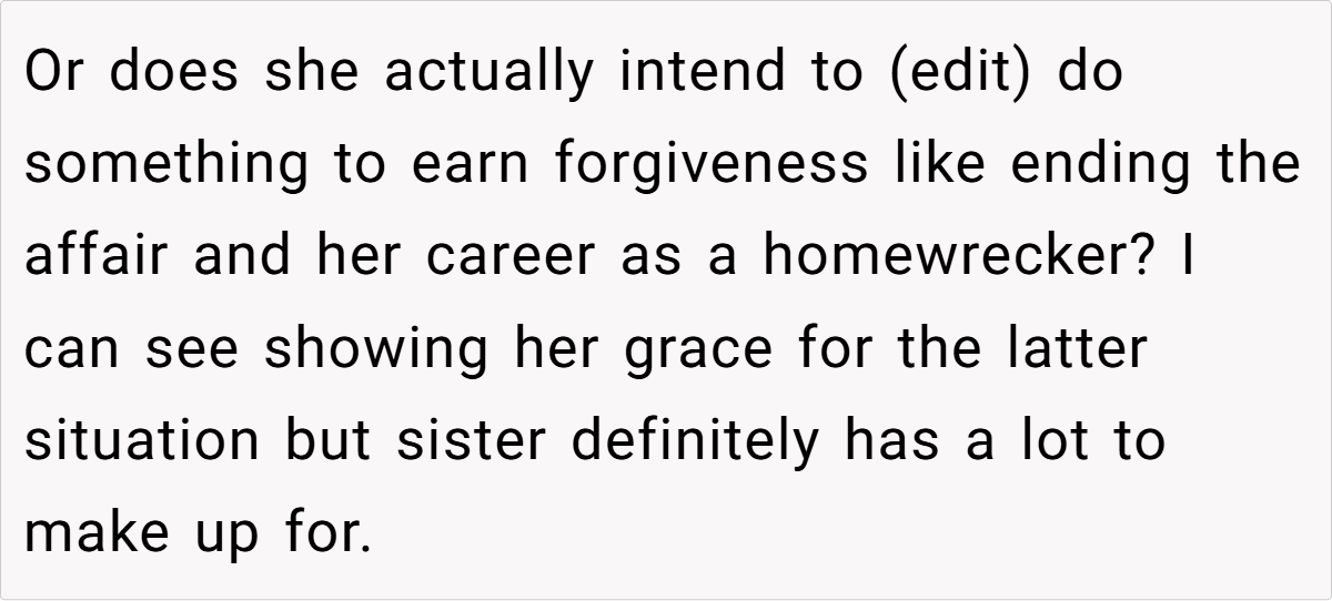 Now, faced with undeniable proof of betrayal and conflicting narratives from a vindictive ex-wife and a desperate sister, the decision was made: love, at least for now, must be withheld. Rather than blindly accepting an untrustworthy version of her sister, the narrator chose to set clear limits—even going so far as to have her sign a tenant’s agreement. It’s a raw, heart-wrenching call for accountability when trust is so deeply broken.