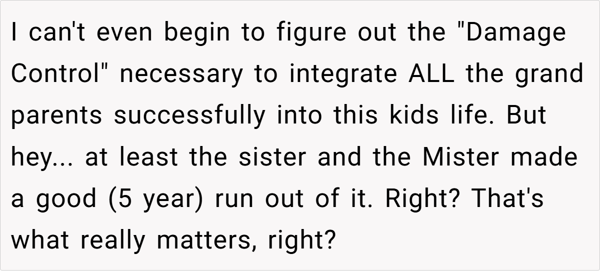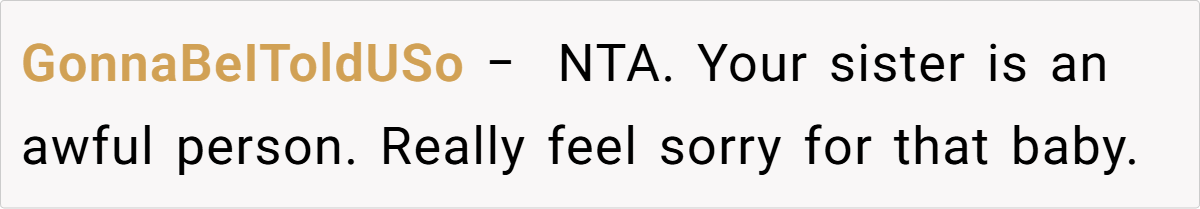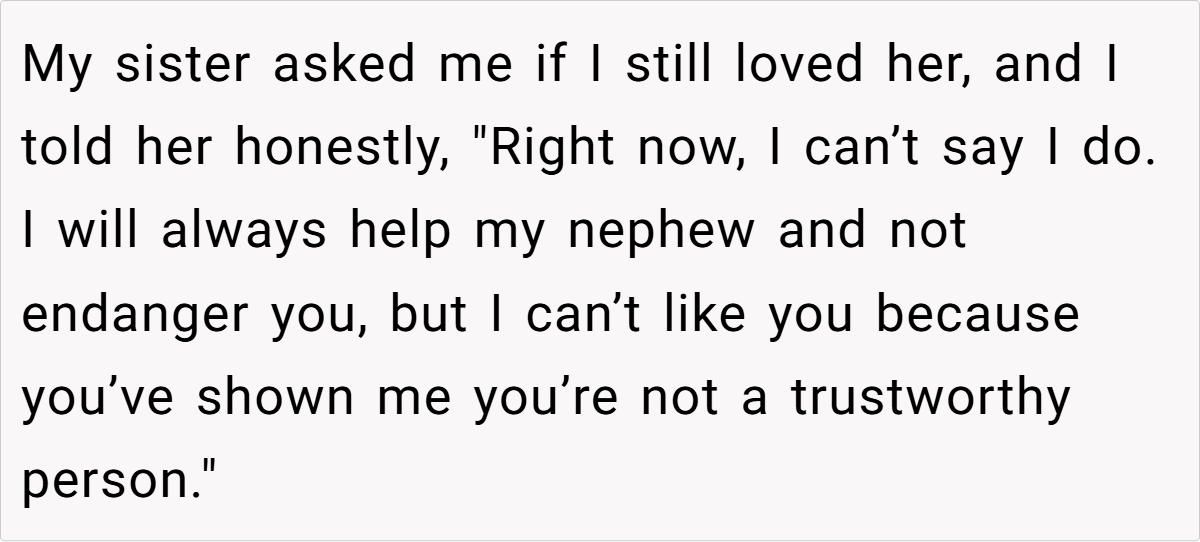 When one party consistently undermines trust, it’s essential to re-evaluate the terms of the relationship.” This perspective is particularly pertinent here, as the narrator’s sister has repeatedly chosen betrayal over honesty, leaving little room for the simple act of love without boundaries.