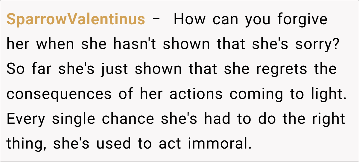 In this case, the narrator’s refusal to offer blanket forgiveness reflects a realistic understanding that love alone cannot override a consistent pattern of deception. Her decision to create boundaries is not just a knee-jerk reaction but an important step in safeguarding her emotional well‐being.