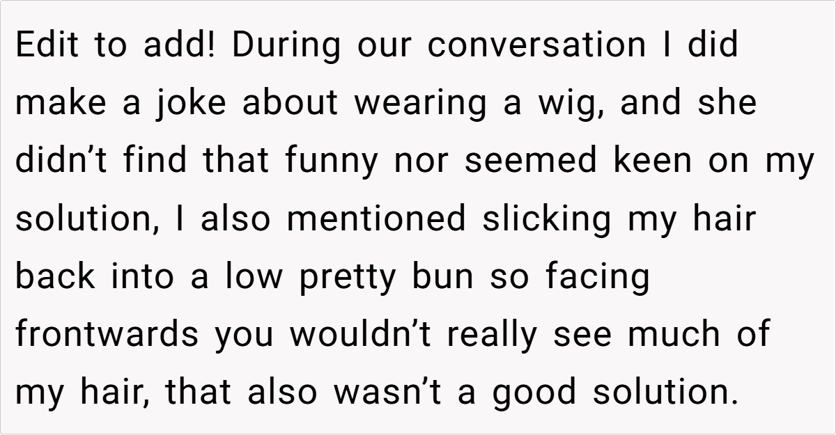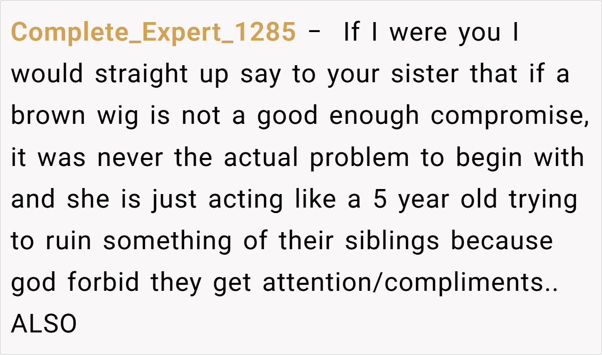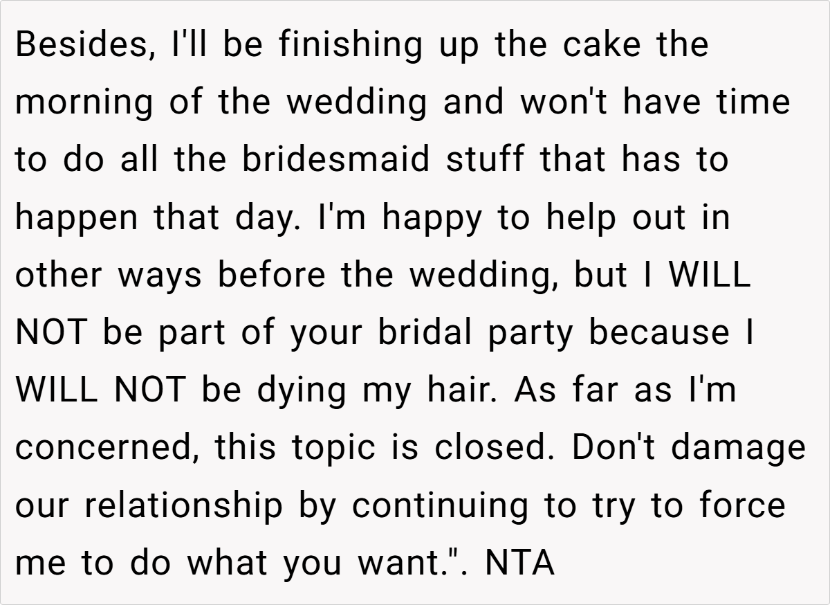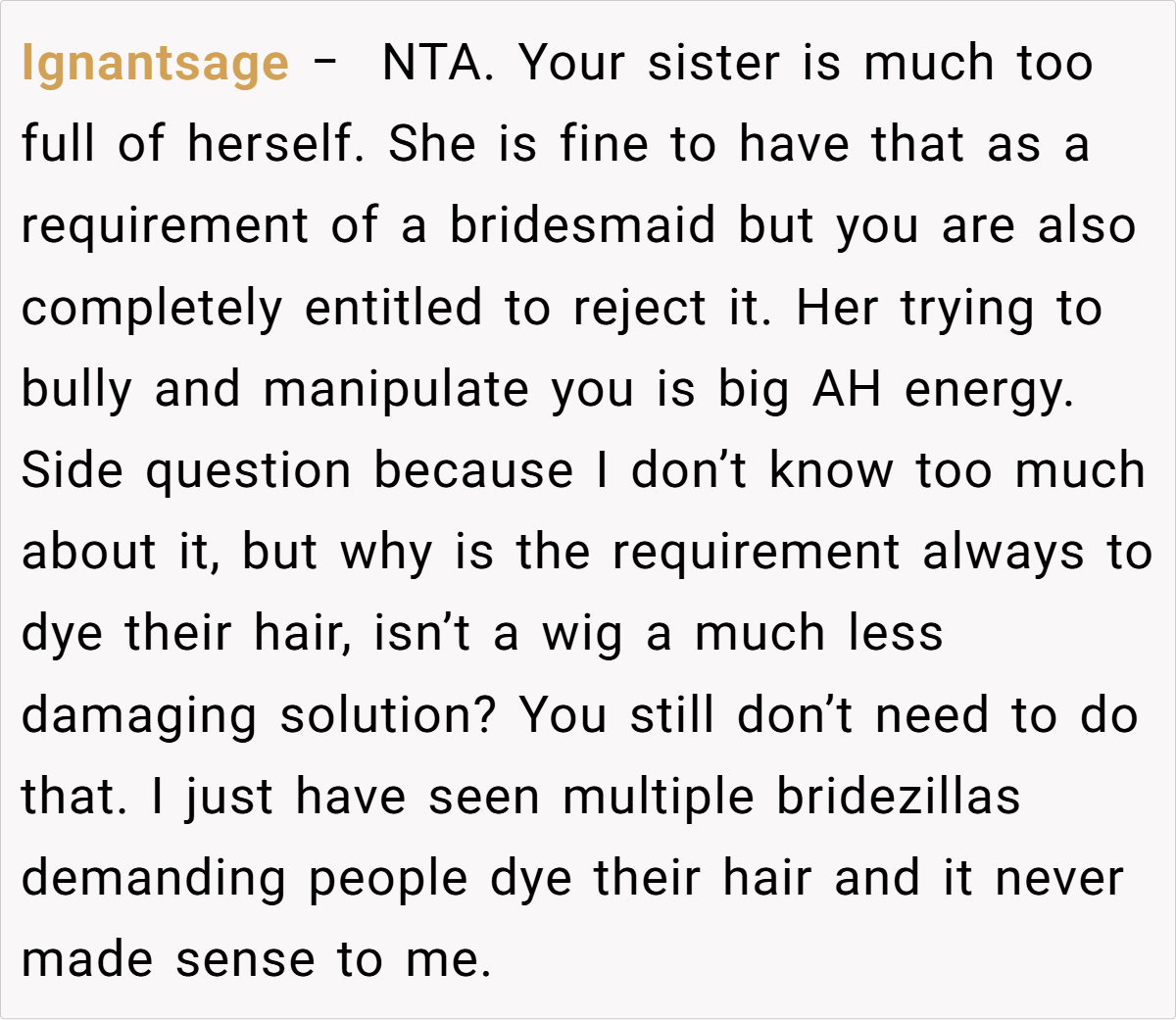When family expectations clash with personal identity, emotions tend to run high. In this case, the pressure to conform to a specific bridal aesthetic has pitted sisterly love against personal authenticity. As the OP explains, her hair isn’t just a style choice—it’s a reflection of who she is and what she’s worked hard to become. It’s understandable that she would feel upset about being asked to change something so intrinsic to her identity, especially on a day already loaded with stress and high expectations.