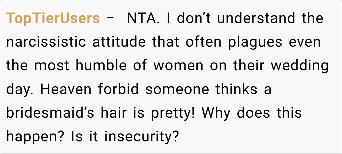 The Reddit community overwhelmingly sided with the OP. Many users praised her for standing firm in her personal style, calling her decision a brave stand against unreasonable expectations. Commenters highlighted that demanding a hair color change simply to keep the spotlight on the bride was both superficial and controlling. In short, the general consensus was that family should celebrate each member’s uniqueness, not force conformity—even on a wedding day.