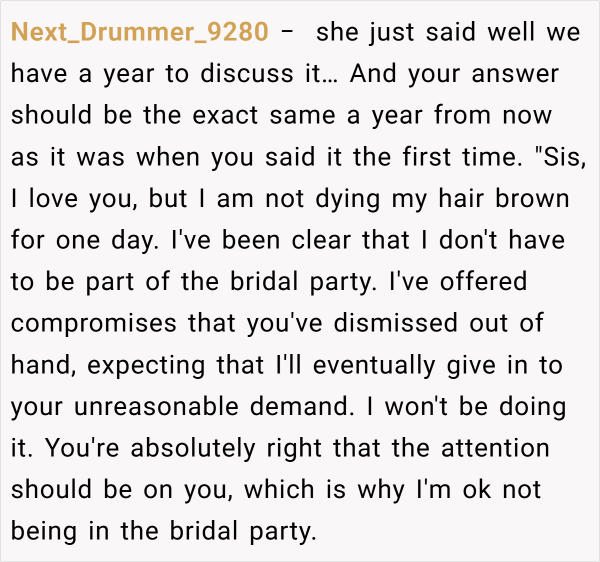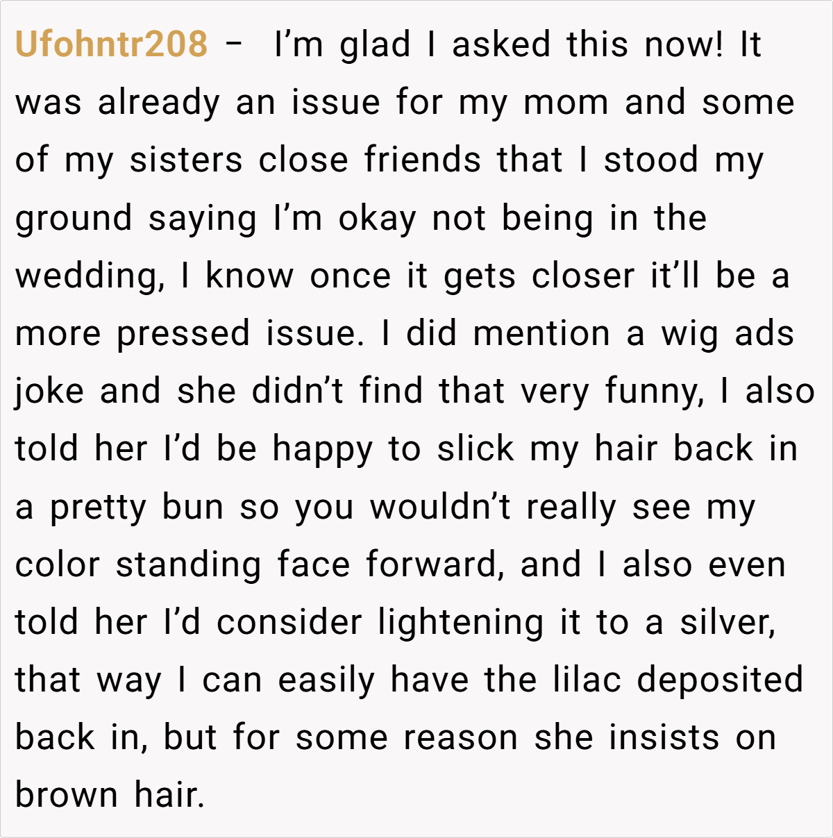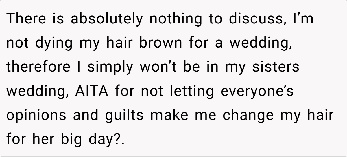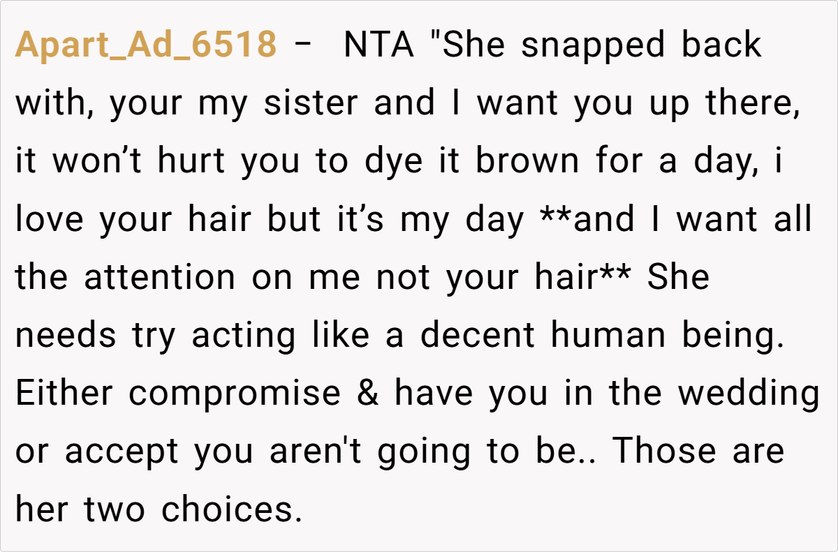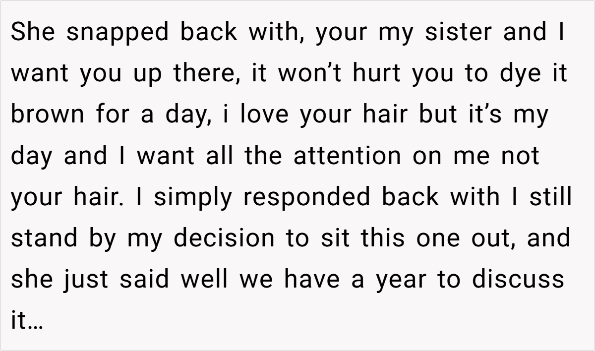The bride insists that for the wedding, her sister should dye her hair brown so that all eyes remain on the bride. Instead, the OP proudly defends her dream hair color, explaining that she’s worked hard to achieve this look and isn’t willing to change it just for one day. This clash between individuality and wedding day perfection sets the stage for a family feud where pride, creativity, and sisterly love are all on the line.