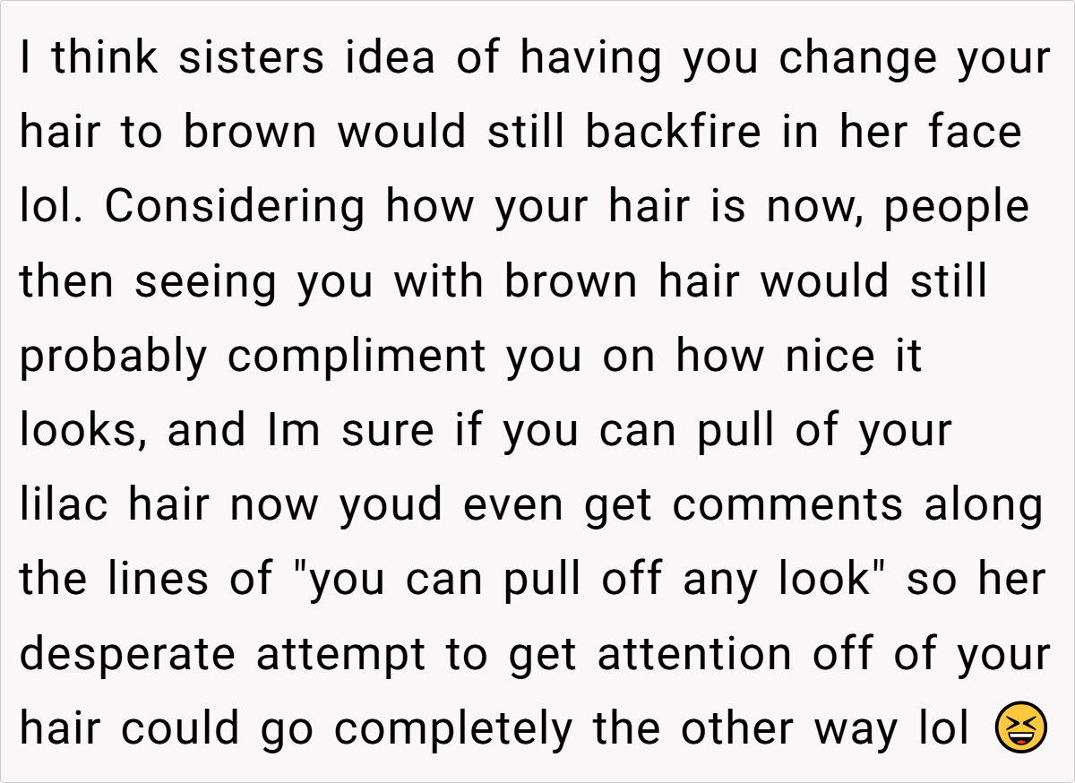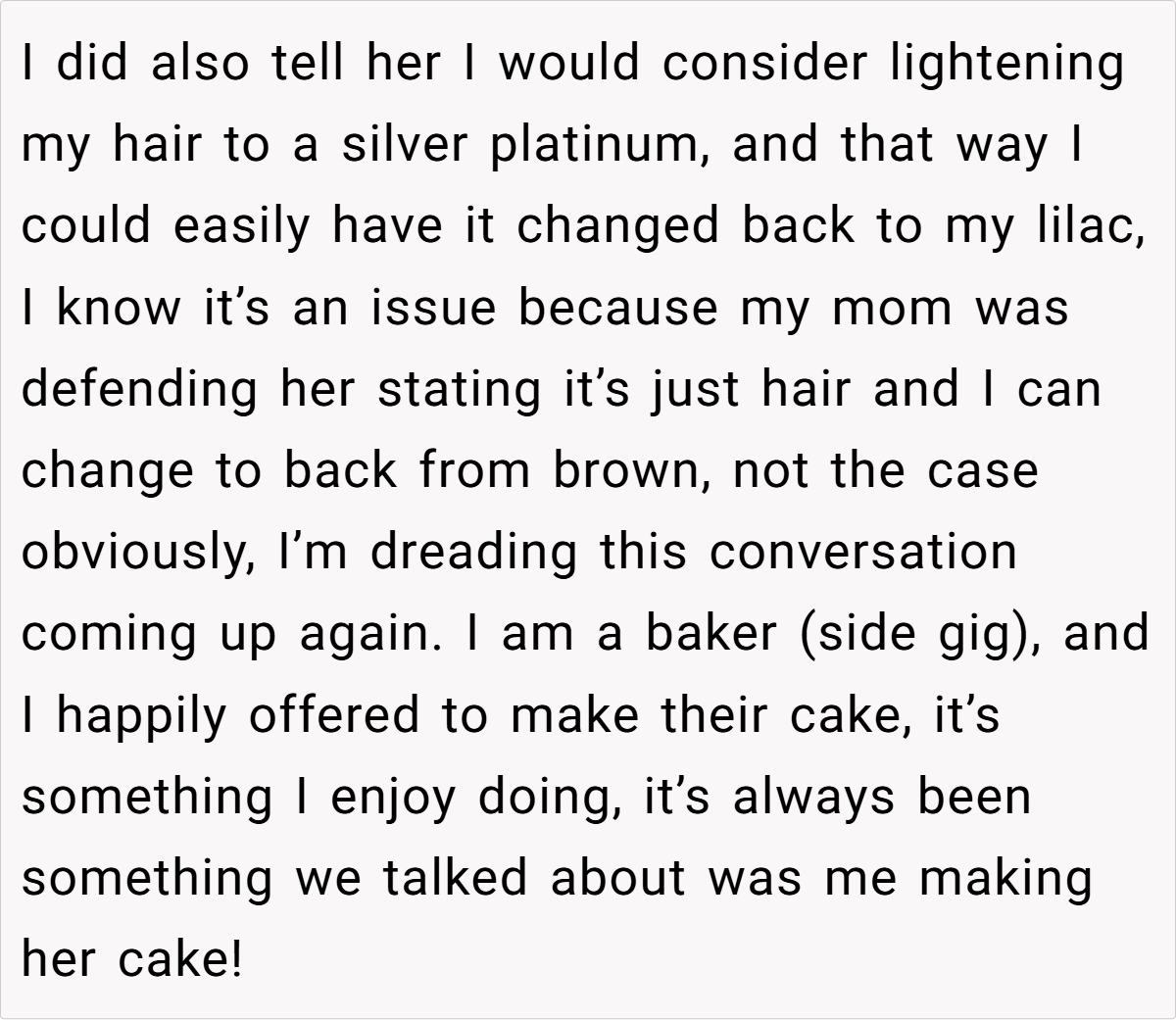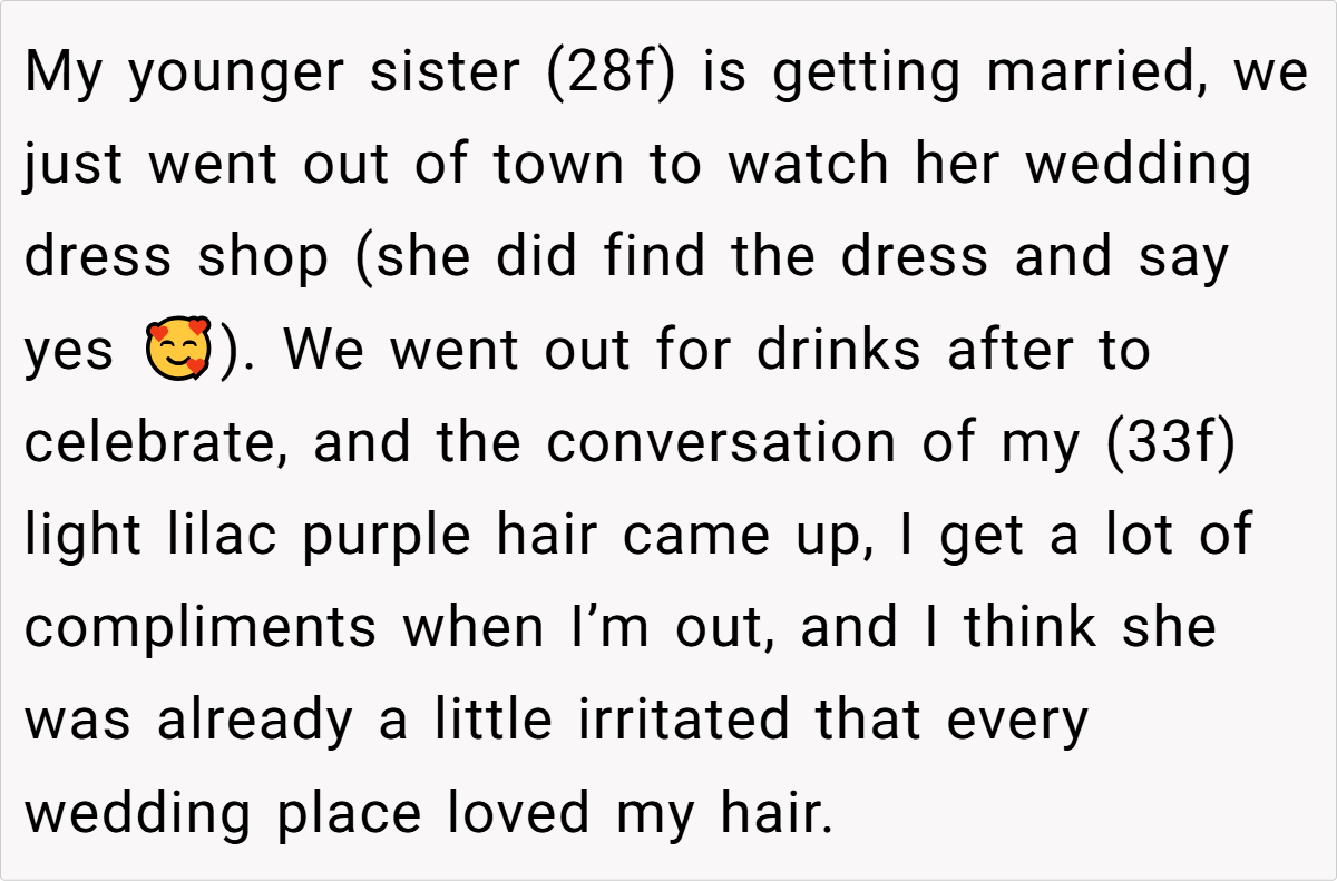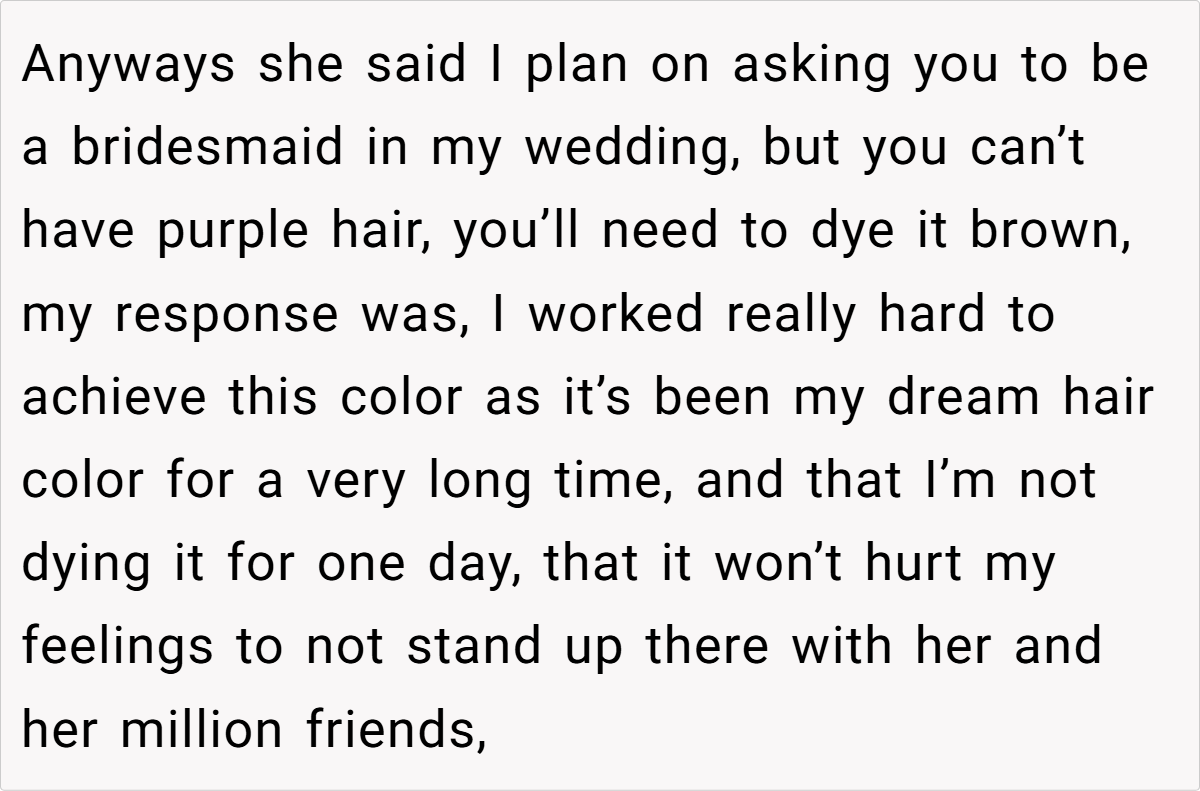 The bride insists that for the wedding, her sister should dye her hair brown so that all eyes remain on the bride. Instead, the OP proudly defends her dream hair color, explaining that she’s worked hard to achieve this look and isn’t willing to change it just for one day. This clash between individuality and wedding day perfection sets the stage for a family feud where pride, creativity, and sisterly love are all on the line.