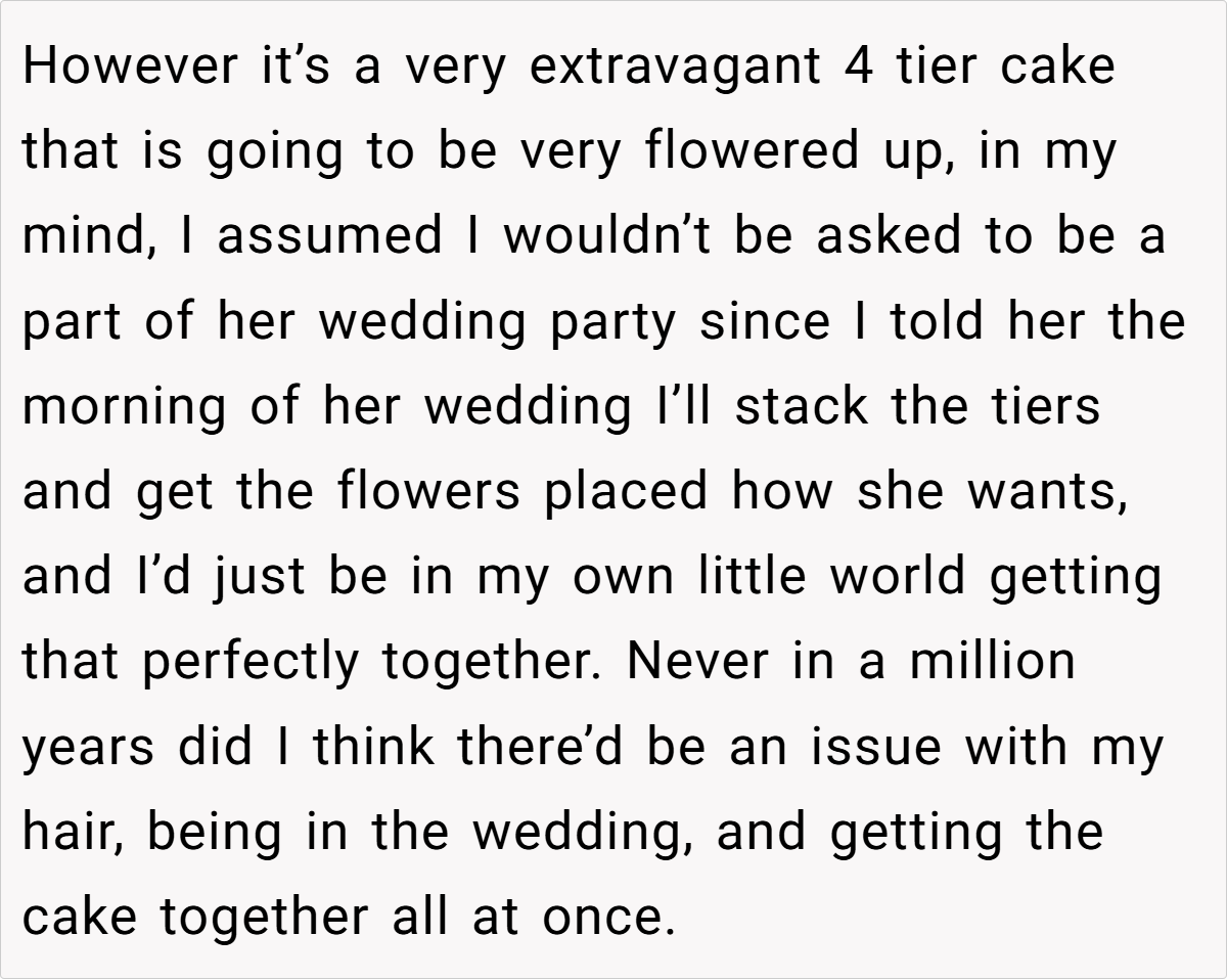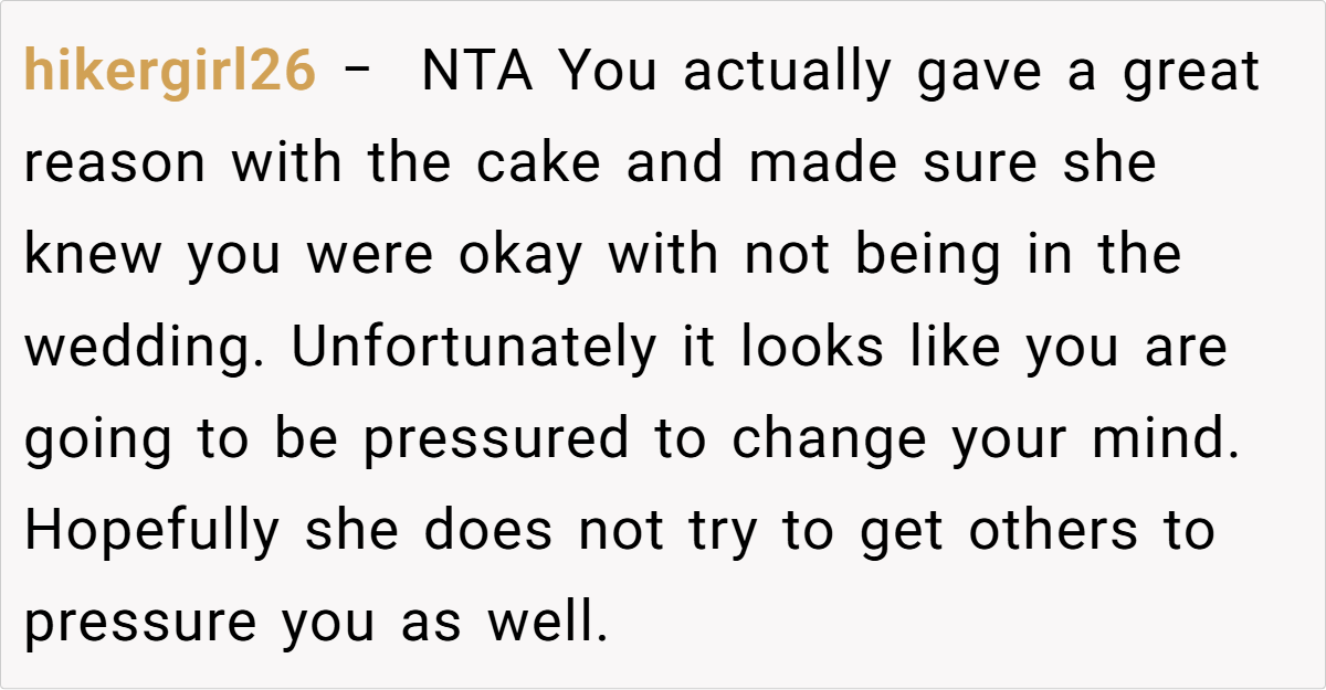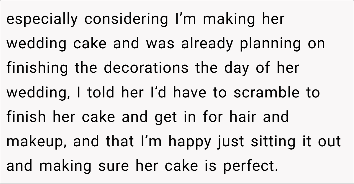 Furthermore, the OP’s role as both a cake maker and a valued family member underscores her many talents and contributions. Her choice to step back from the bridal party—while still actively supporting the wedding in other ways—highlights an important point: being part of a family celebration doesn’t require sacrificing one’s identity.