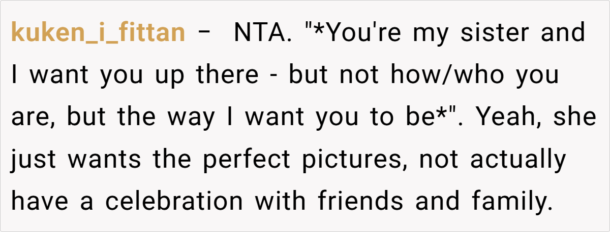 Moreover, the situation reveals a broader issue often seen in family events: the pressure for the bride to control every detail. While wedding days are undeniably special for the couple, the insistence that every participant fit a specific mold can diminish the celebration of individual uniqueness.