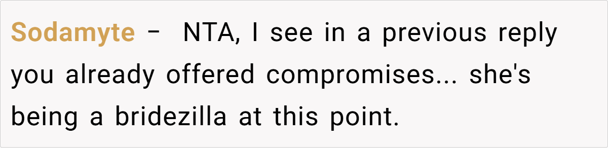 In the midst of planning the big day—and while also preparing to bake an extravagant four-tier wedding cake—the tension escalates. The OP’s refusal to compromise her identity for the sake of tradition has left both sides standing firm. With wedding plans in full swing and emotions running high, the stage is set for a discussion about boundaries, self-expression, and the meaning of family support.