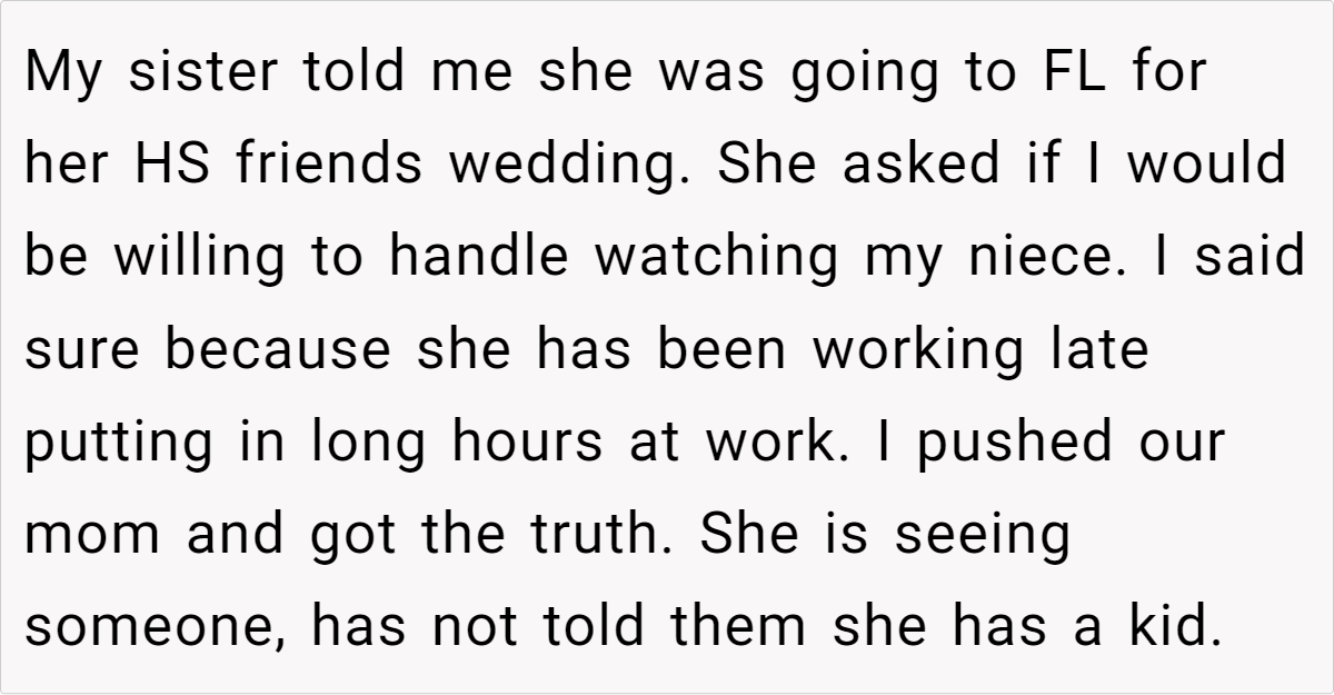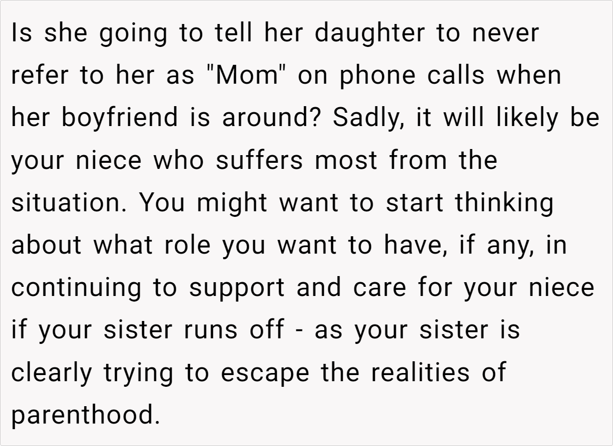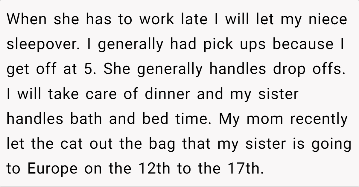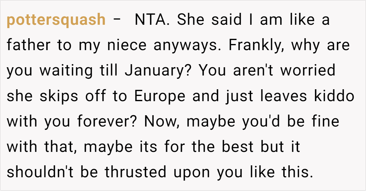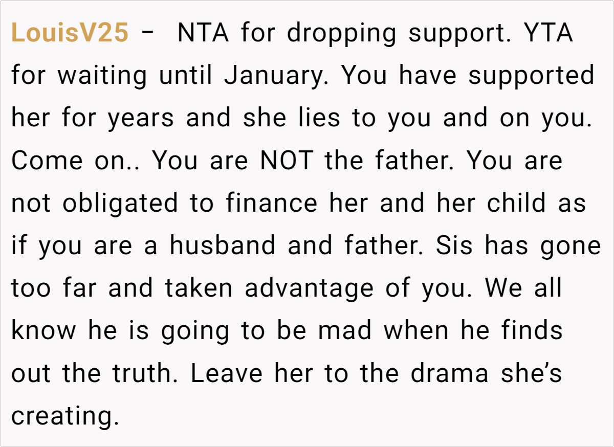 Yet everything changed when he discovered she was planning a trip to Europe with a new partner who doesn’t even know she has a child. Worse, she told this new partner that the niece is her brother’s kid, not hers.This discovery was a wake-up call for the OP: he realized not only the extent of his sister’s deception, but also how she’s prioritizing a new romance over her own daughter’s well-being. Now, with concerns about how this will affect his niece, the OP is ready to cut off support by January.