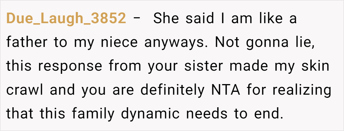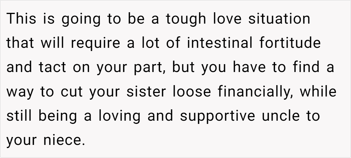 While providing financial and emotional support to family can be a kind gesture, it sometimes crosses into enabling if it allows the recipient to avoid responsibility. Dr. Barbara Greenberg, a clinical psychologist and parenting expert, notes that “a pattern of consistent rescue can inadvertently reinforce immature or deceptive behaviors.” In this case, the OP has gone beyond helping: he’s been taking on an unofficial paternal role for his niece and essentially covering many parenting responsibilities that should belong to the child’s mother.