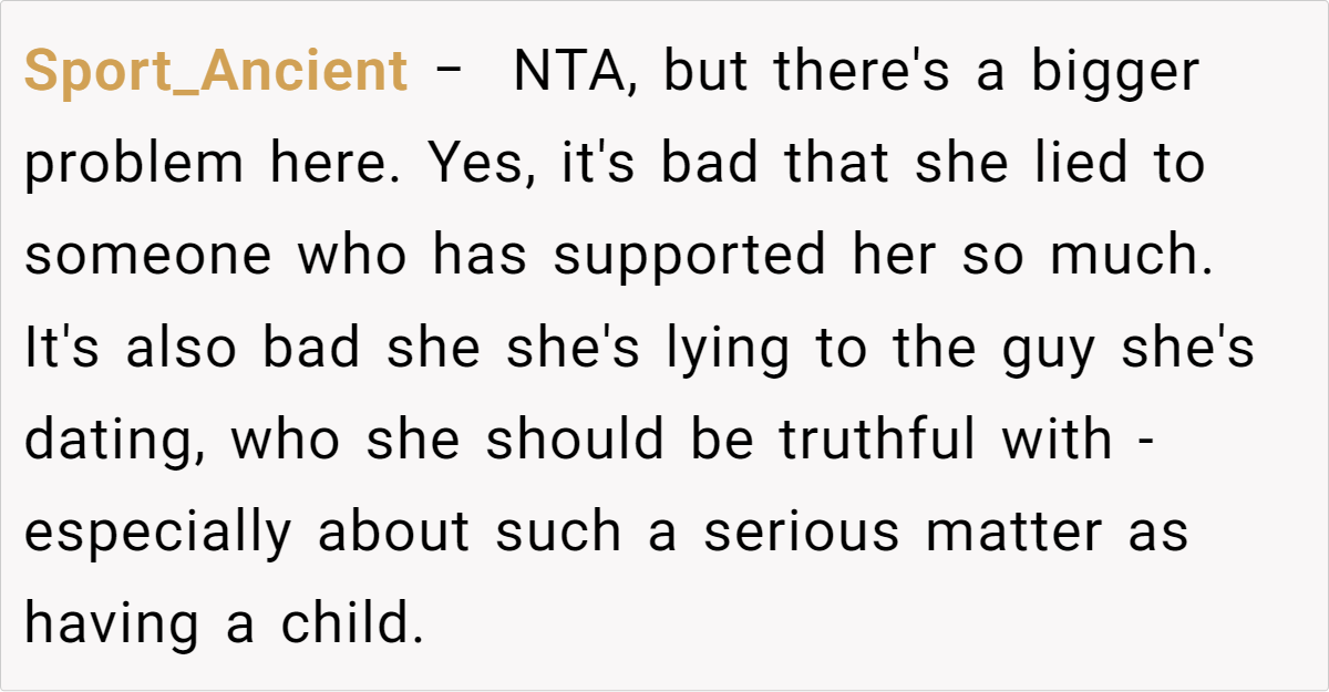The revelation that the sister lied about having a child is a massive red flag. If she’s concealing such a critical fact from her new partner, it suggests a deep fear of abandonment or a refusal to embrace her role as a mother. According to Dr. Greenberg, “A single parent needs to be transparent about their child right away when dating,” because children can’t be hidden in the long-term without causing emotional harm—especially to the child, who may sense they’re an unwanted secret.