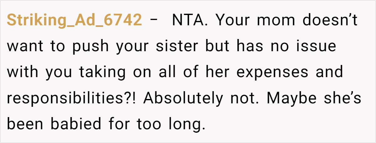 When establishing such boundaries, it’s crucial to communicate them openly, explaining that the goal is not punishment, but a push toward responsible adulthood. If the sister reacts with hostility rather than self-reflection, it further highlights the dysfunction and underscores the need for a firm limit.