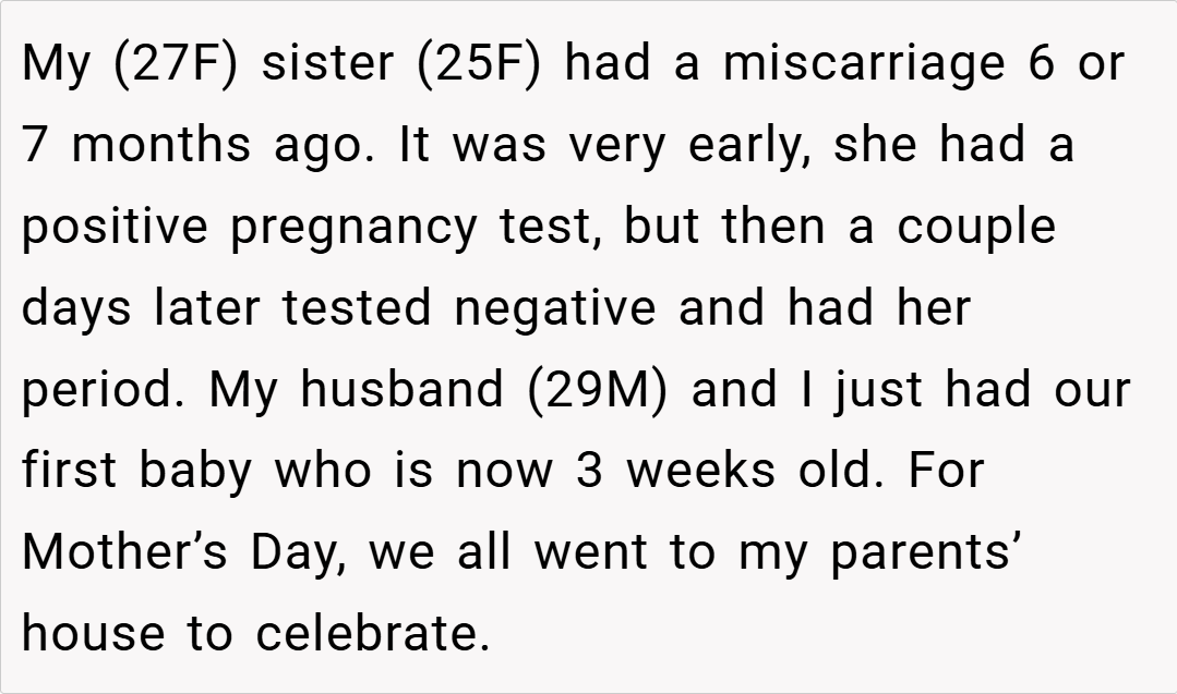 Family celebrations can stir up old wounds, especially around sensitive topics like motherhood and loss. I (27F) recently experienced a tense Mother’s Day at my parents’ house. While I celebrated my first true Mother’s Day with my 3‑week‑old baby—something incredibly special given my past traumatic experiences—I ended up clashing with my younger sister (25F).
