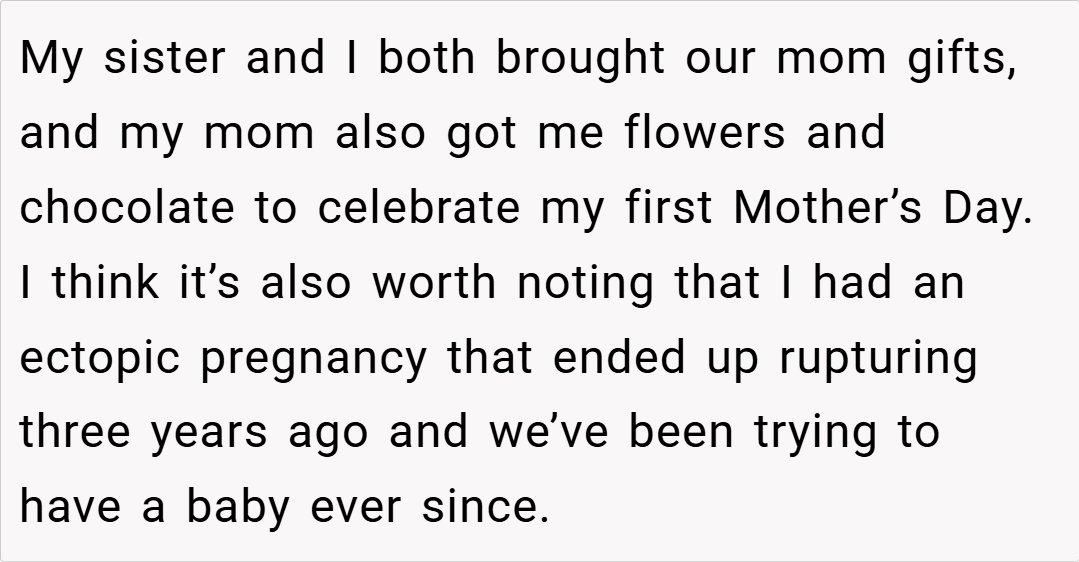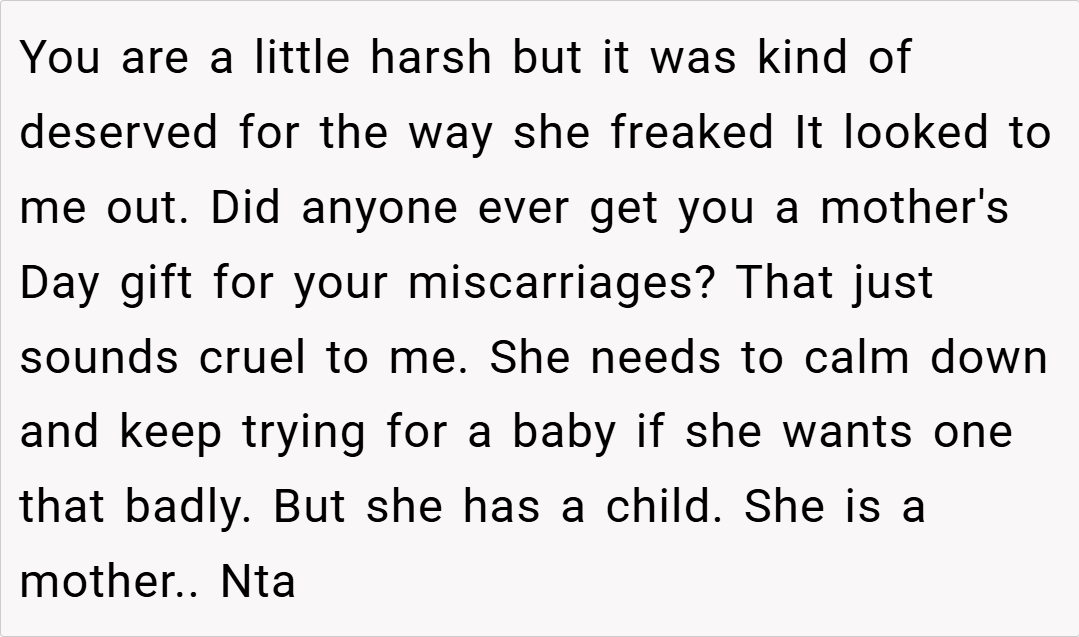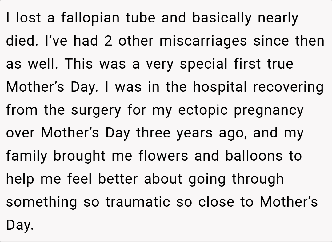 Another redditor shared, “I get that you needed to speak your truth—Mother’s Day can be a minefield for those who’ve experienced miscarriage or infertility. You’re not obligated to sugarcoat your feelings.”