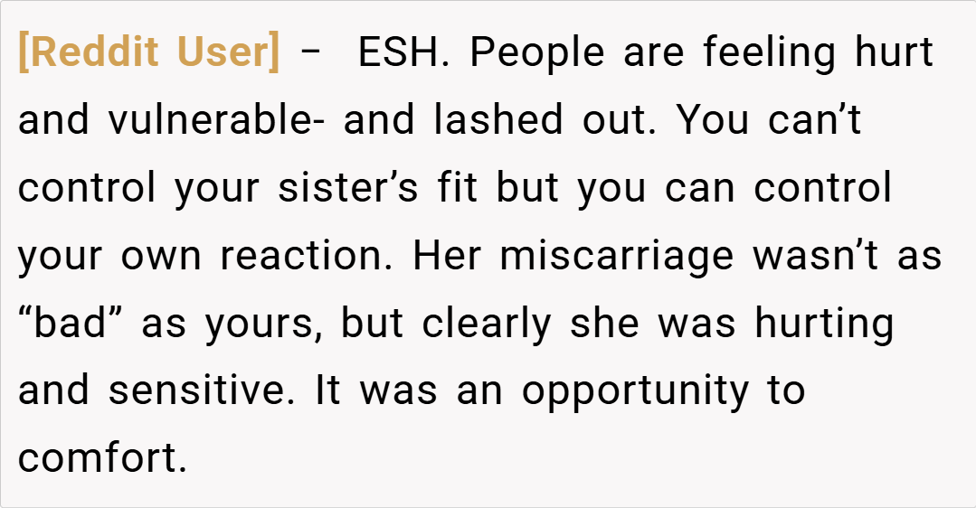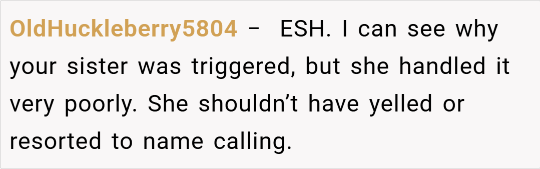 She continues, “It’s important to recognize that while your feelings are valid, the manner in which you express them can have lasting impacts on family relationships. A more empathetic approach might have allowed you to express your pain without exacerbating your sister’s grief.”