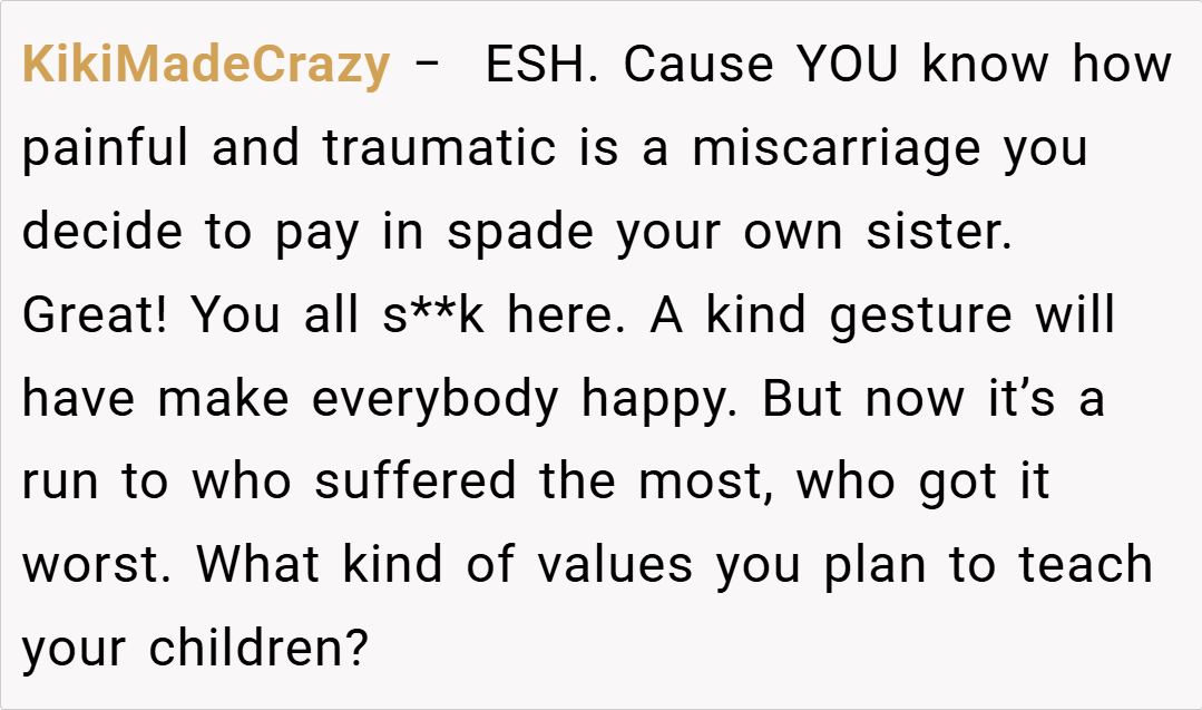 Ultimately, your decision to tell your sister that nobody owes her a Mother’s Day gift stems from genuine hurt and the feeling of imbalance in your family’s celebrations. While your blunt honesty reflects your deep-seated pain, it may have also compounded your sister’s own grief over her miscarriage. This situation raises an important question: How do we balance the need to express our own pain with the necessity of being sensitive to others’ experiences, especially in a family setting?