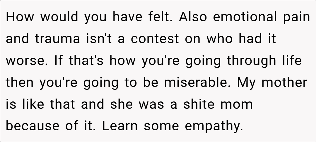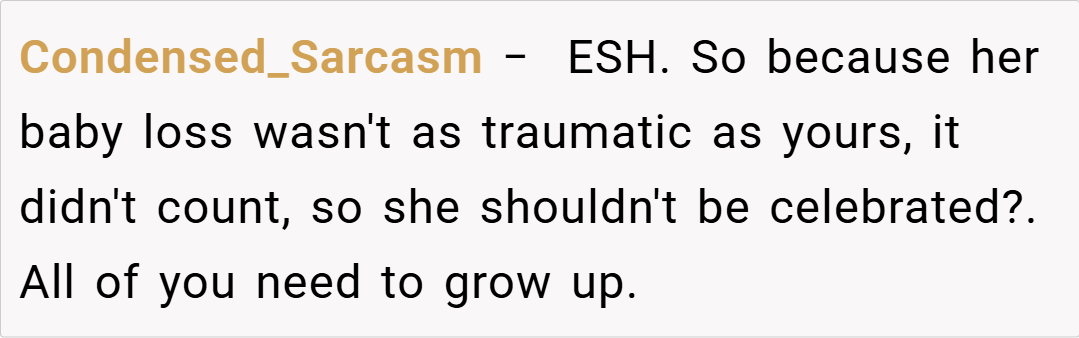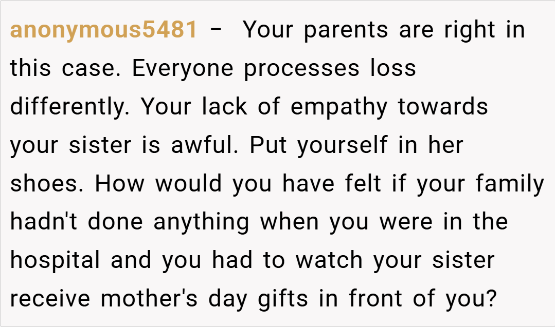 Several redditors expressed support for your reaction. One user commented, “After everything you’ve been through, it’s understandable that you’d feel resentful about the way your family celebrates Mother’s Day. If your sister hasn’t received any acknowledgment for her loss, you’re not wrong for calling it out.”