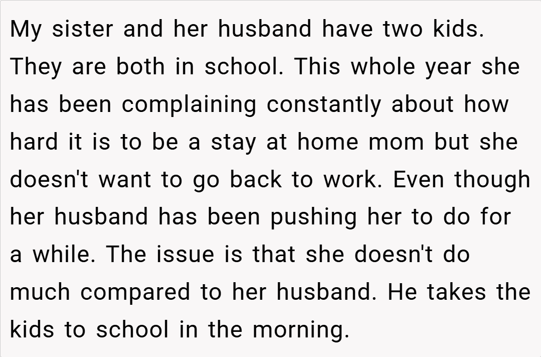 Family dynamics can be a minefield, especially when it comes to balancing the challenges of parenting with personal accountability. In today’s story, a woman recounts a heated exchange with her sister about the realities of being a stay-at-home mom. Despite having two kids whose school schedules leave plenty of free time during the day, her sister has repeatedly complained about how hard her role is—without making the necessary effort to contribute to household chores or even consider working part-time.
