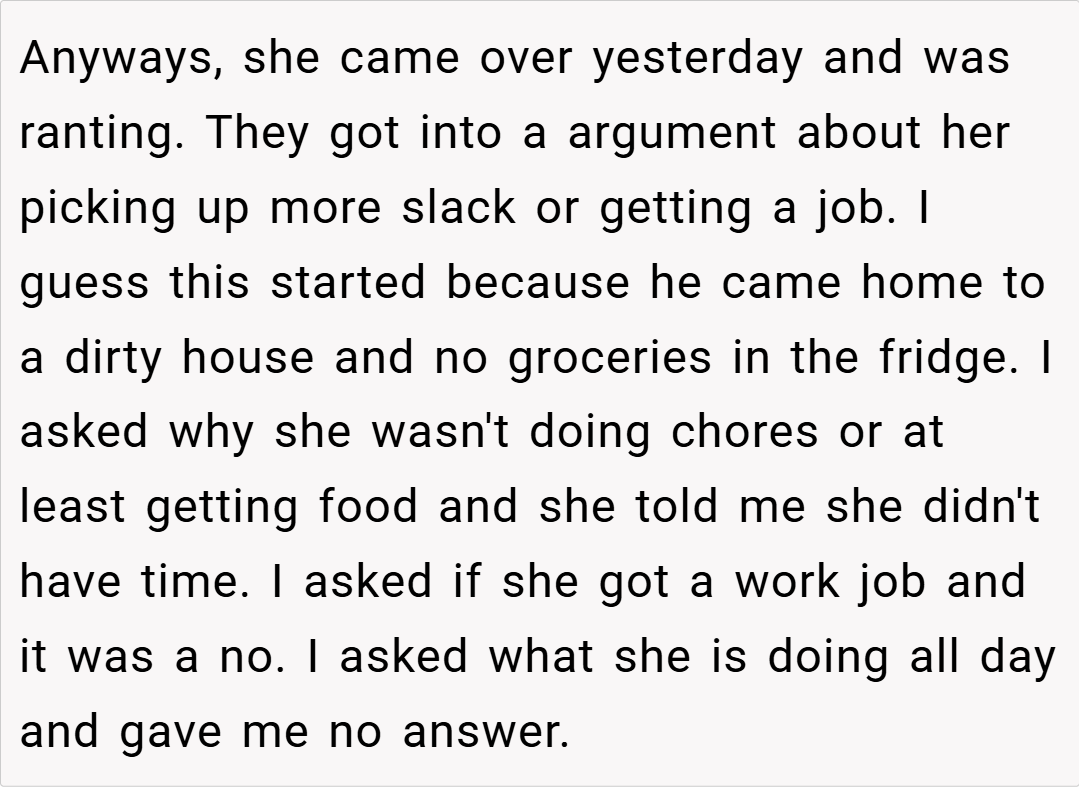 After yet another argument sparked by a messy house and an empty fridge, our storyteller finally snapped. In a moment of unfiltered honesty, she told her sister that she wasn’t a martyr for staying at home and that if she were her husband, she’d be considering divorce because her lack of responsibility made her act more like a child than a partner. This blunt remark ignited a fresh dispute and left many wondering whether her candor was justified or simply too harsh.