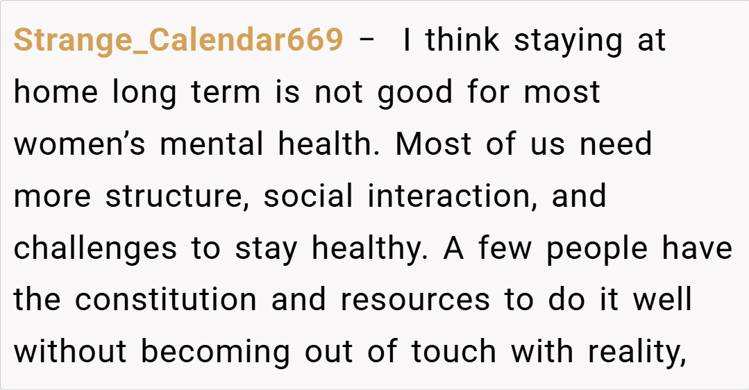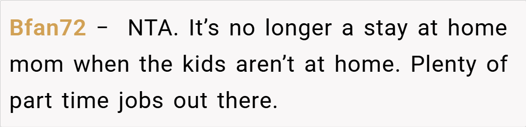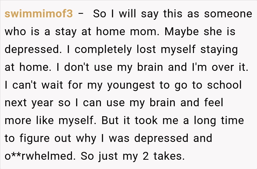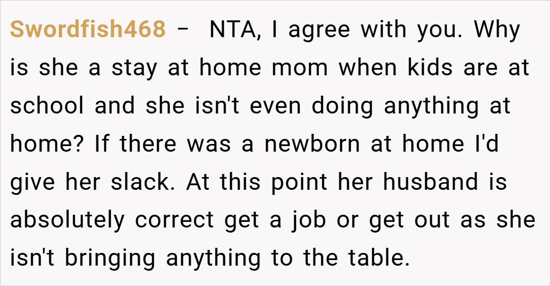 Many redditors sympathize with the storyteller, arguing that while the role of a stay-at-home mom is undoubtedly challenging, it isn’t an excuse to shirk responsibility or avoid contributing to household upkeep. They commend her for calling out behavior that could eventually erode the trust and balance in a marriage.