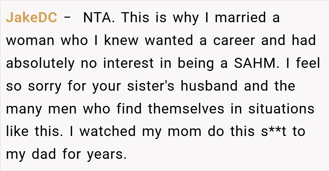 ‘AITA for telling my sister she is not a martyr for staying at home and if I was her husband I would divorce her?’