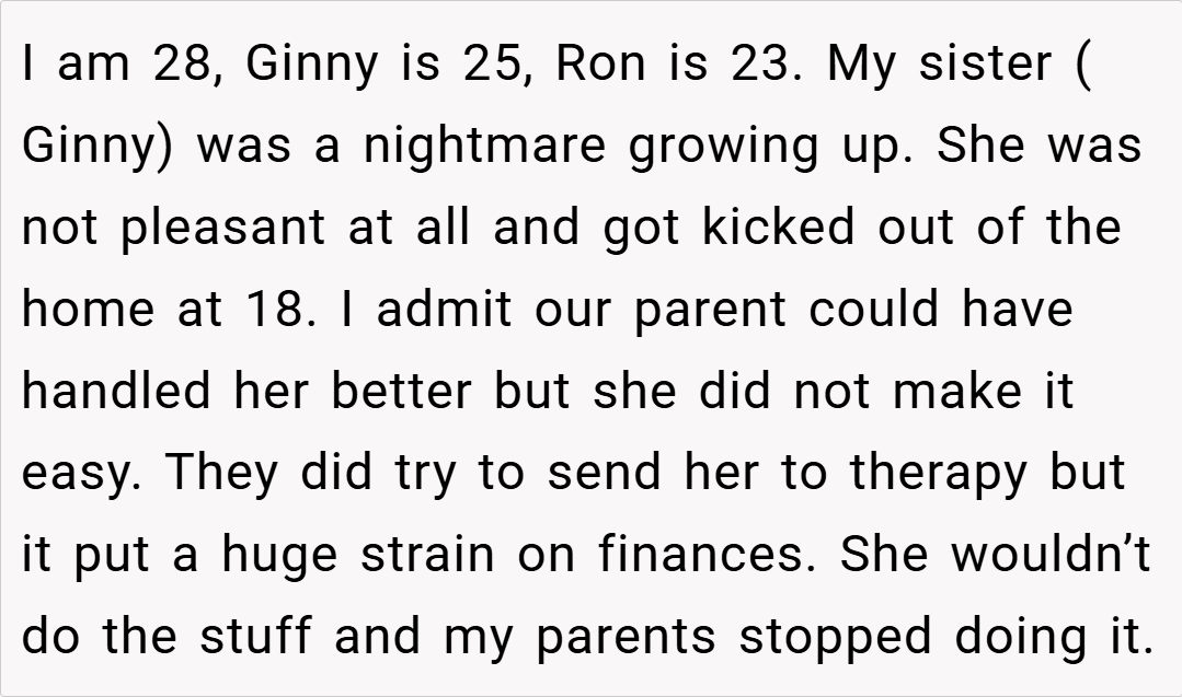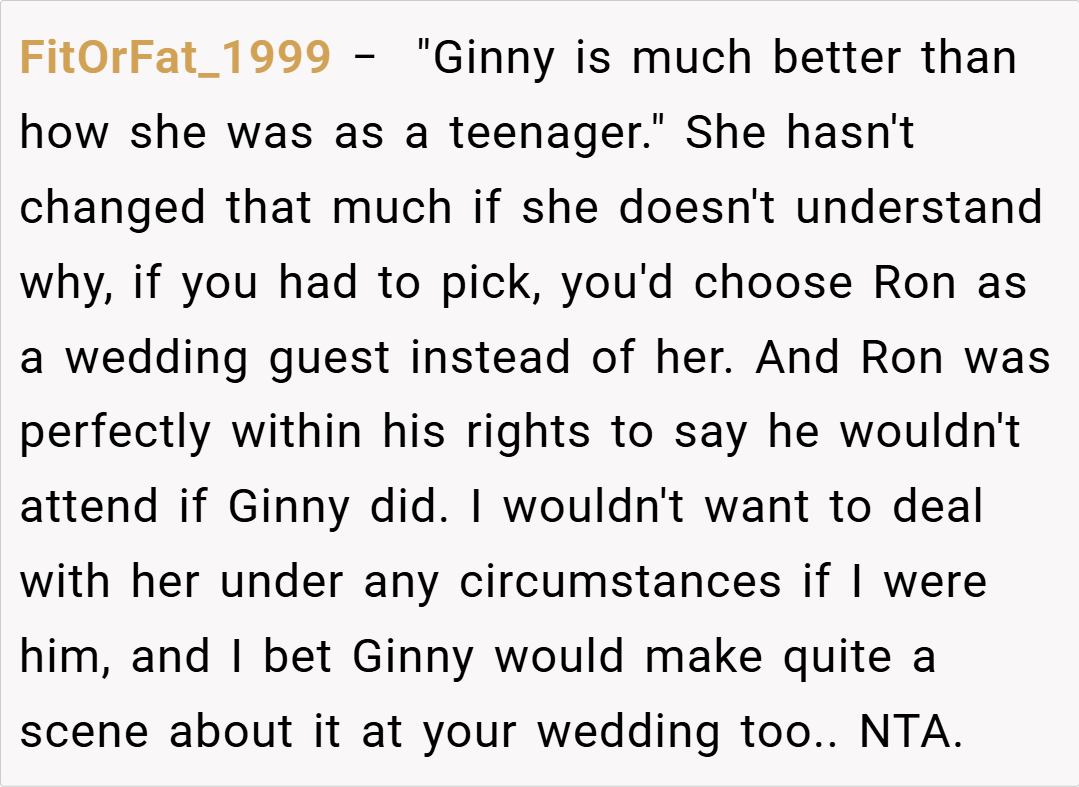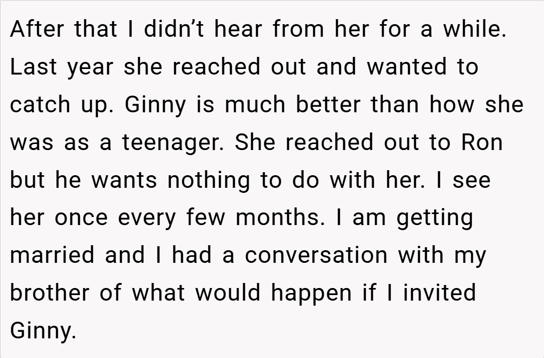 In this case, the choice to uninvite Ginny reflects deep-seated issues from years of bullying and neglect, particularly affecting her younger brother Ron. The emotional scars from a turbulent childhood have not easily faded, and for Ron, maintaining distance is essential for his mental health. The older sibling’s decision to prioritize Ron’s comfort at her wedding underscores a commitment to healing and self-care—even when it means confronting painful family dynamics that have lingered over time.