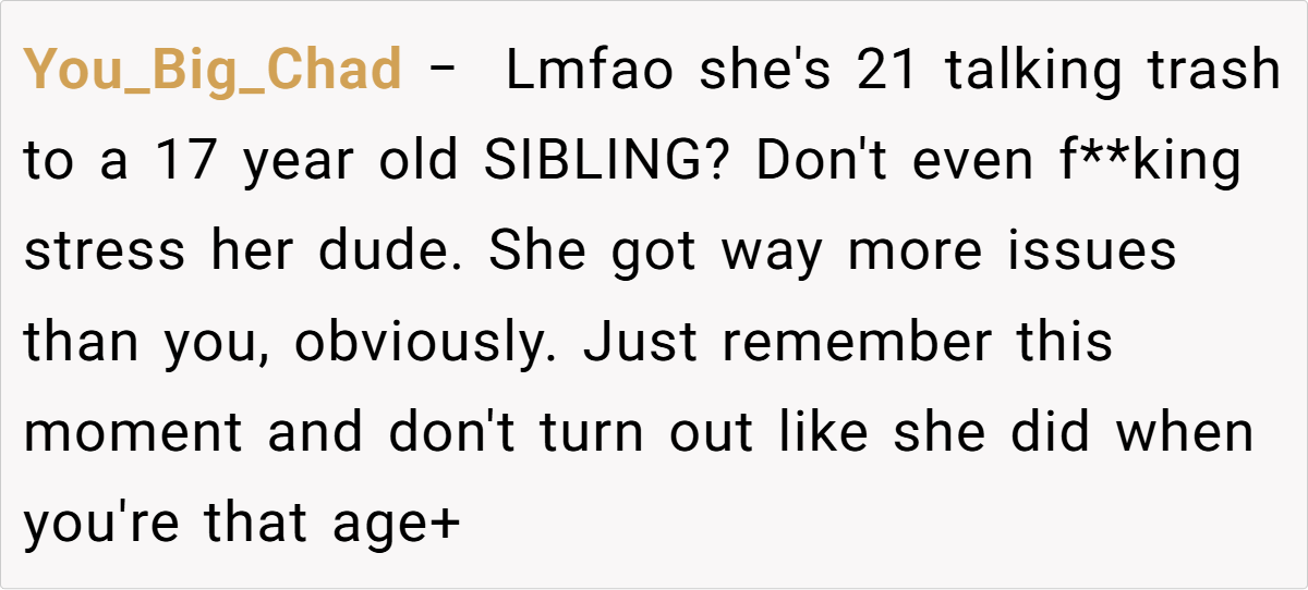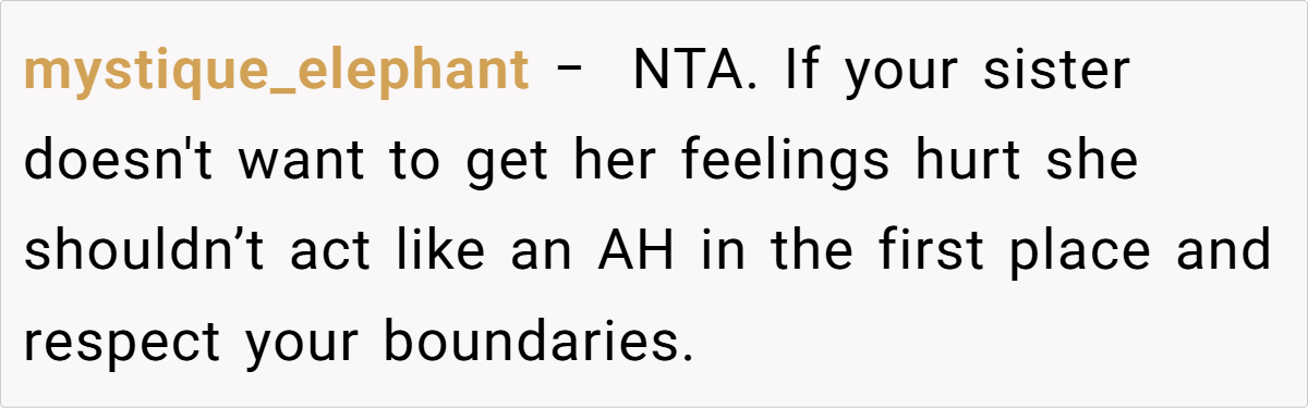 The Reddit community weighed in with a broad consensus that the younger sibling was not at fault. Many users noted that her repeated, polite requests to reclaim her space were reasonable and that her sister’s aggressive response was disproportionate. The overall sentiment was clear: respect for personal boundaries is crucial, and when it’s compromised, it’s not only hurtful but also indicative of deeper issues. While opinions varied in tone, the general agreement was that both parties could benefit from more open, respectful communication.