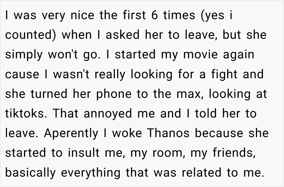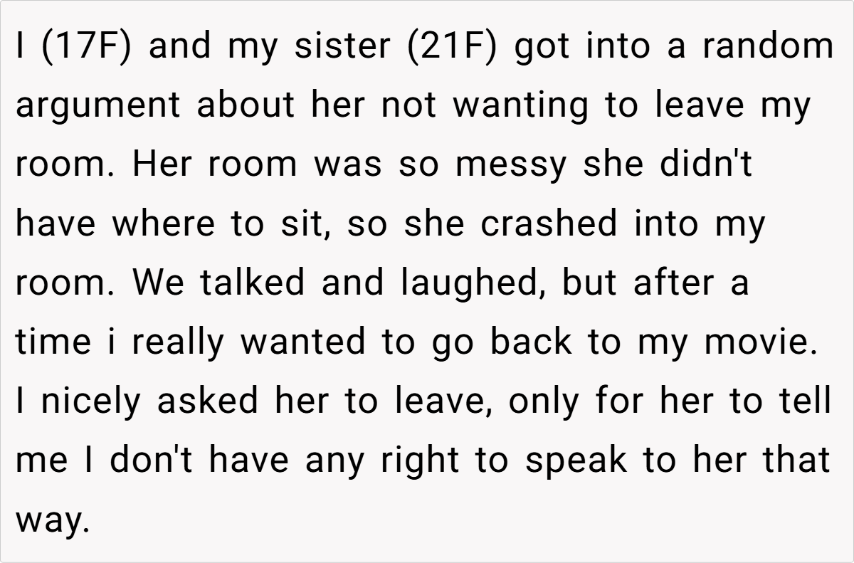 In the heat of everyday life, conflicts over personal space can erupt in the most unexpected ways. Our featured redditor, a 17-year-old navigating the trials of adolescence, found herself in an escalating dispute with her 21-year-old sister. What started as a lighthearted intrusion into her room quickly turned sour, leaving behind feelings of hurt and frustration. The incident unfolded over a seemingly trivial matter—a messy room and an unwanted guest—but it soon revealed deeper issues of respect and boundaries.