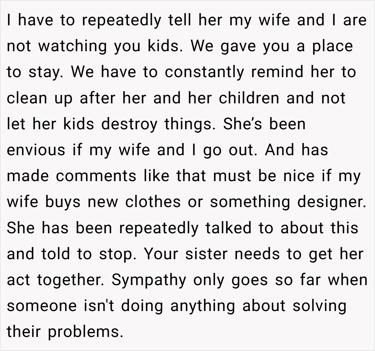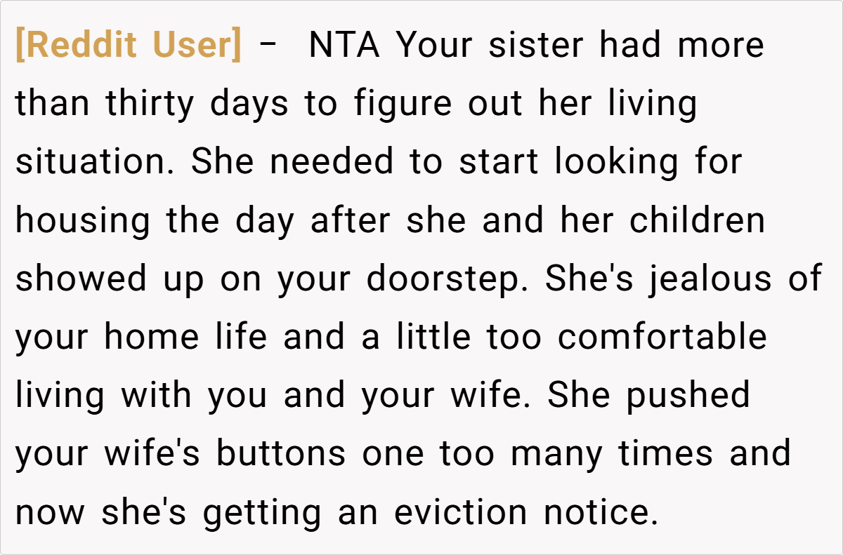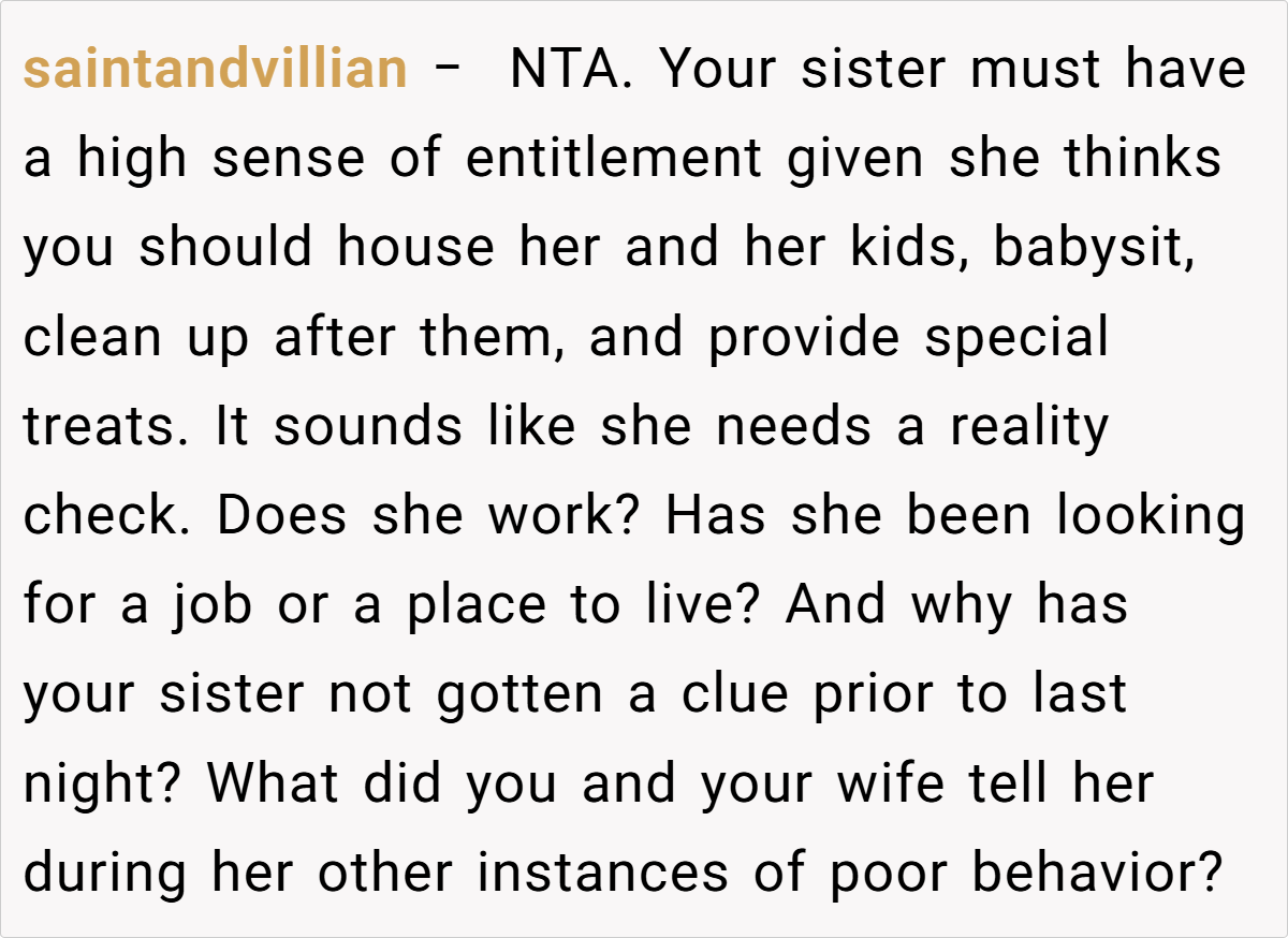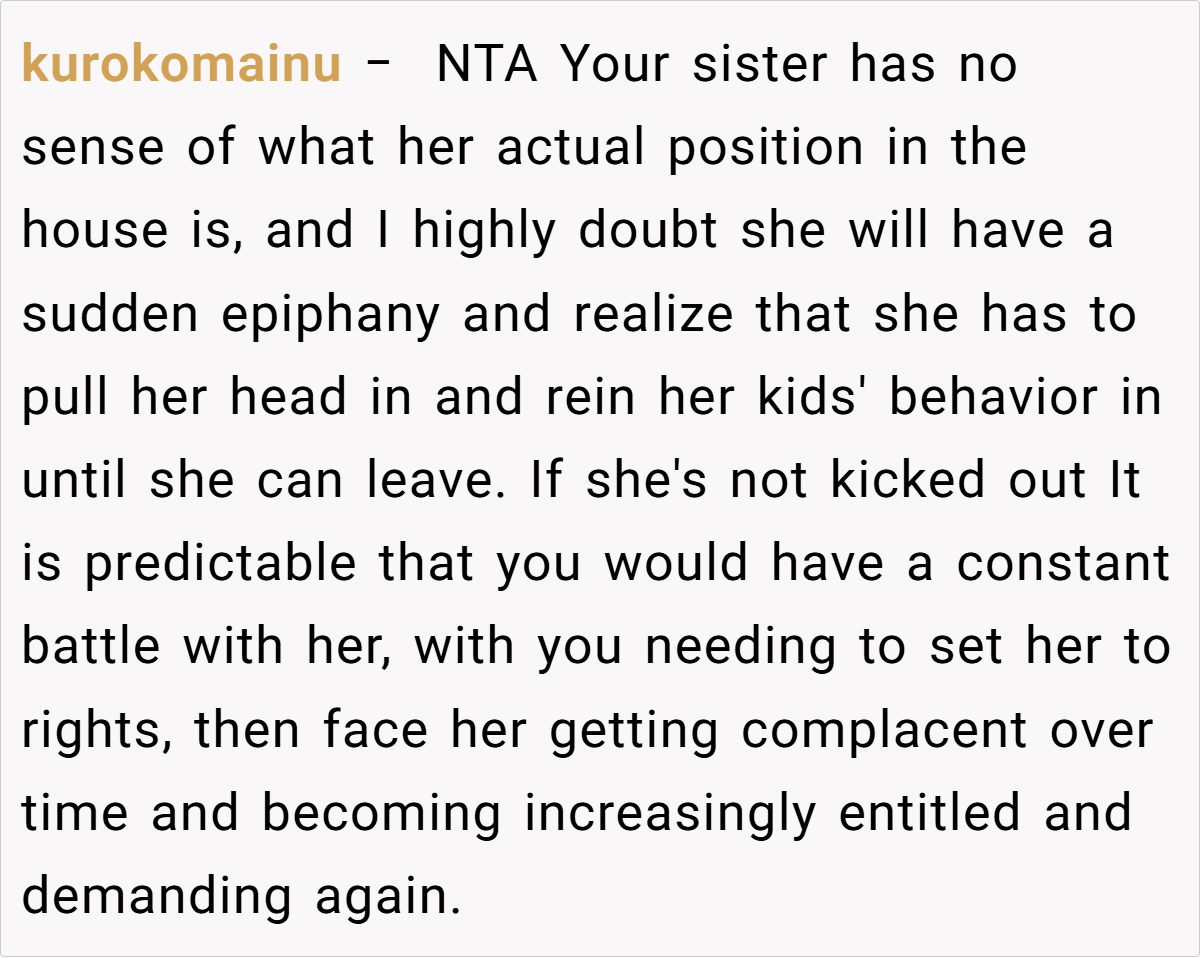 Here are some hot takes from the Reddit community—candid, humorous, and refreshingly blunt. Numerous redditors agree that the sister’s behavior has crossed the line of acceptable entitlement. They point out that while offering help during a crisis is commendable, it doesn’t give someone carte blanche to dictate household rules. The consensus is that the OP is right to enforce boundaries, and many applaud the decision to set a clear deadline for her to find alternate housing.