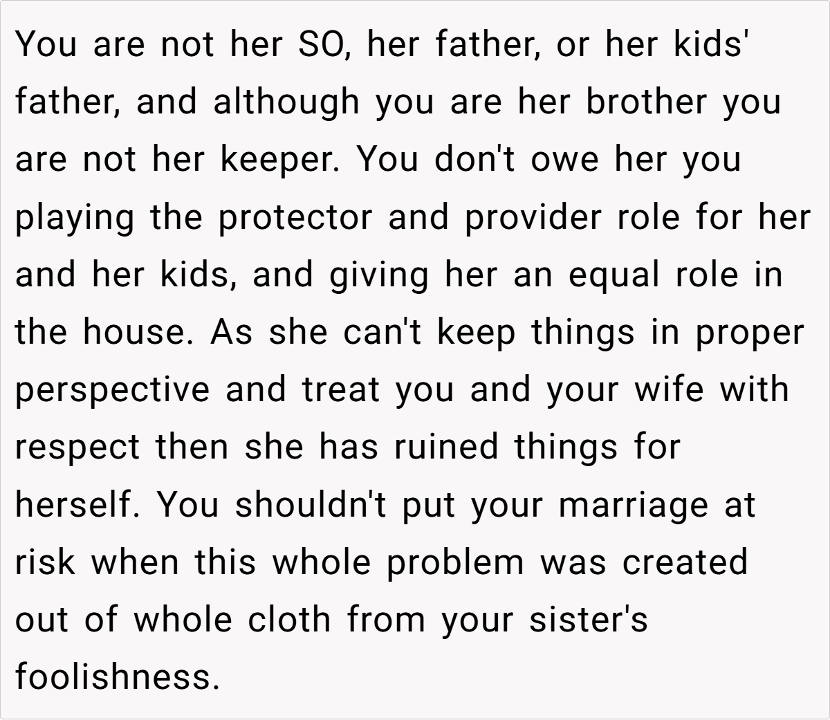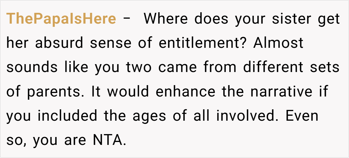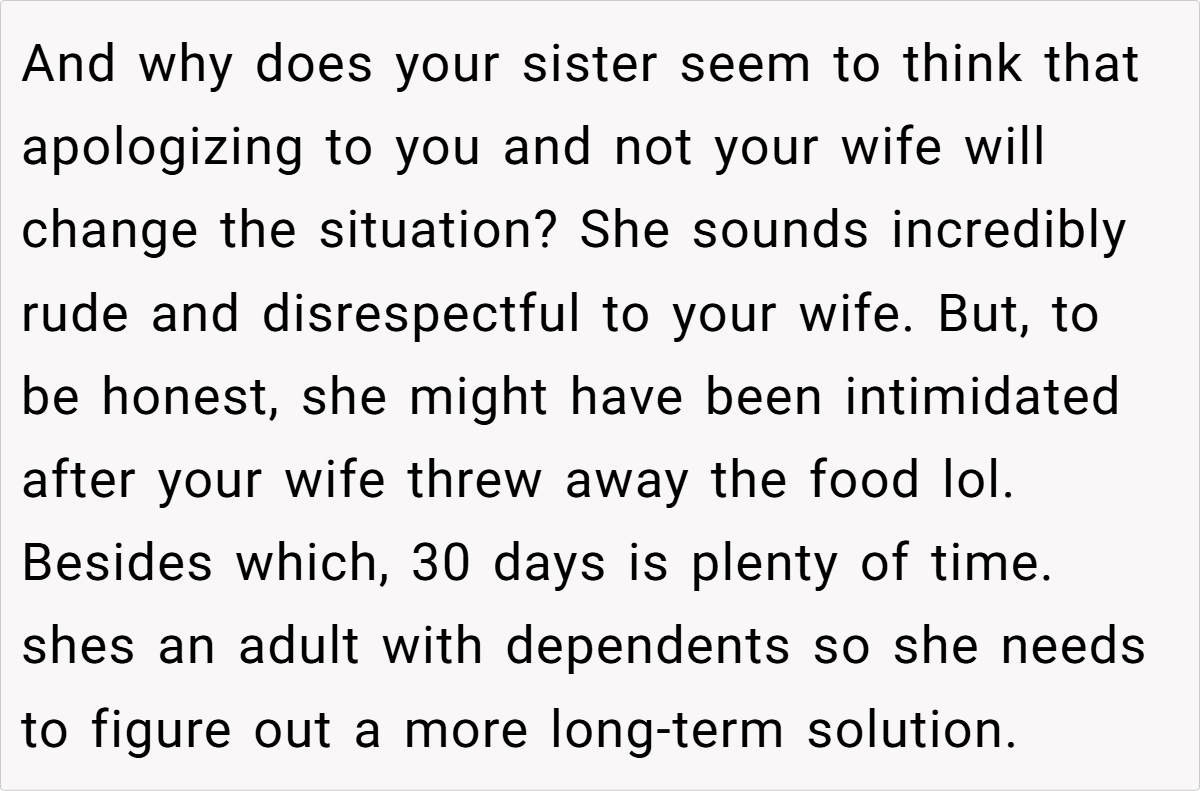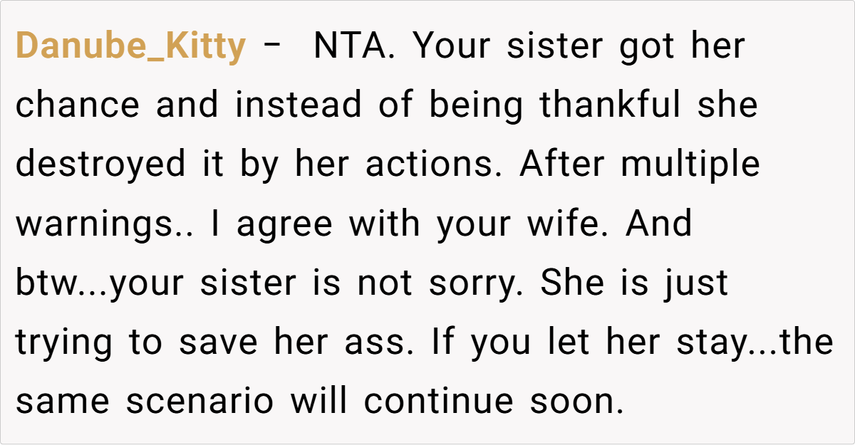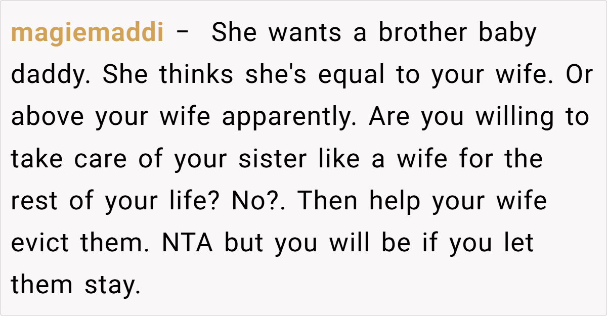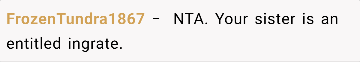 Here are some hot takes from the Reddit community—candid, humorous, and refreshingly blunt. Numerous redditors agree that the sister’s behavior has crossed the line of acceptable entitlement. They point out that while offering help during a crisis is commendable, it doesn’t give someone carte blanche to dictate household rules. The consensus is that the OP is right to enforce boundaries, and many applaud the decision to set a clear deadline for her to find alternate housing.