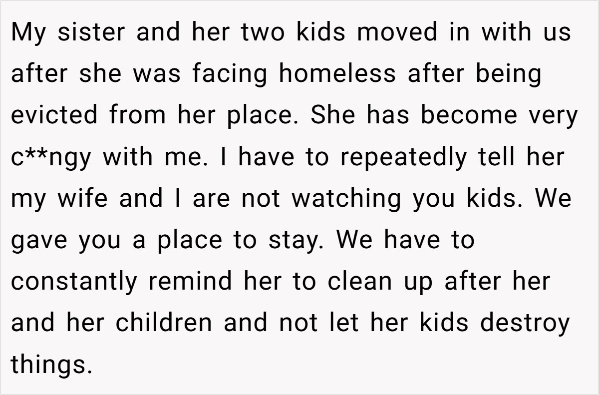 Family dynamics can sometimes resemble a pressure cooker, especially when generosity meets entitlement. In this case, a Redditor shares a turbulent story of offering shelter to his sister and her two kids during a time of crisis—only to have the gesture turn sour as expectations and resentments come to a head. The tension builds in a household where the balance between compassion and personal boundaries is constantly tested.